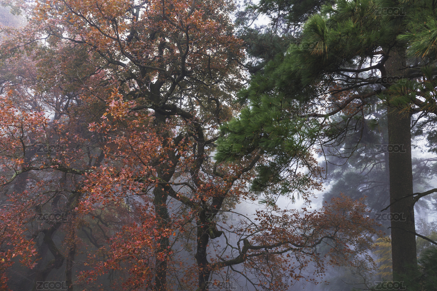 中国南岳衡山浓雾弥漫的森林中的红叶