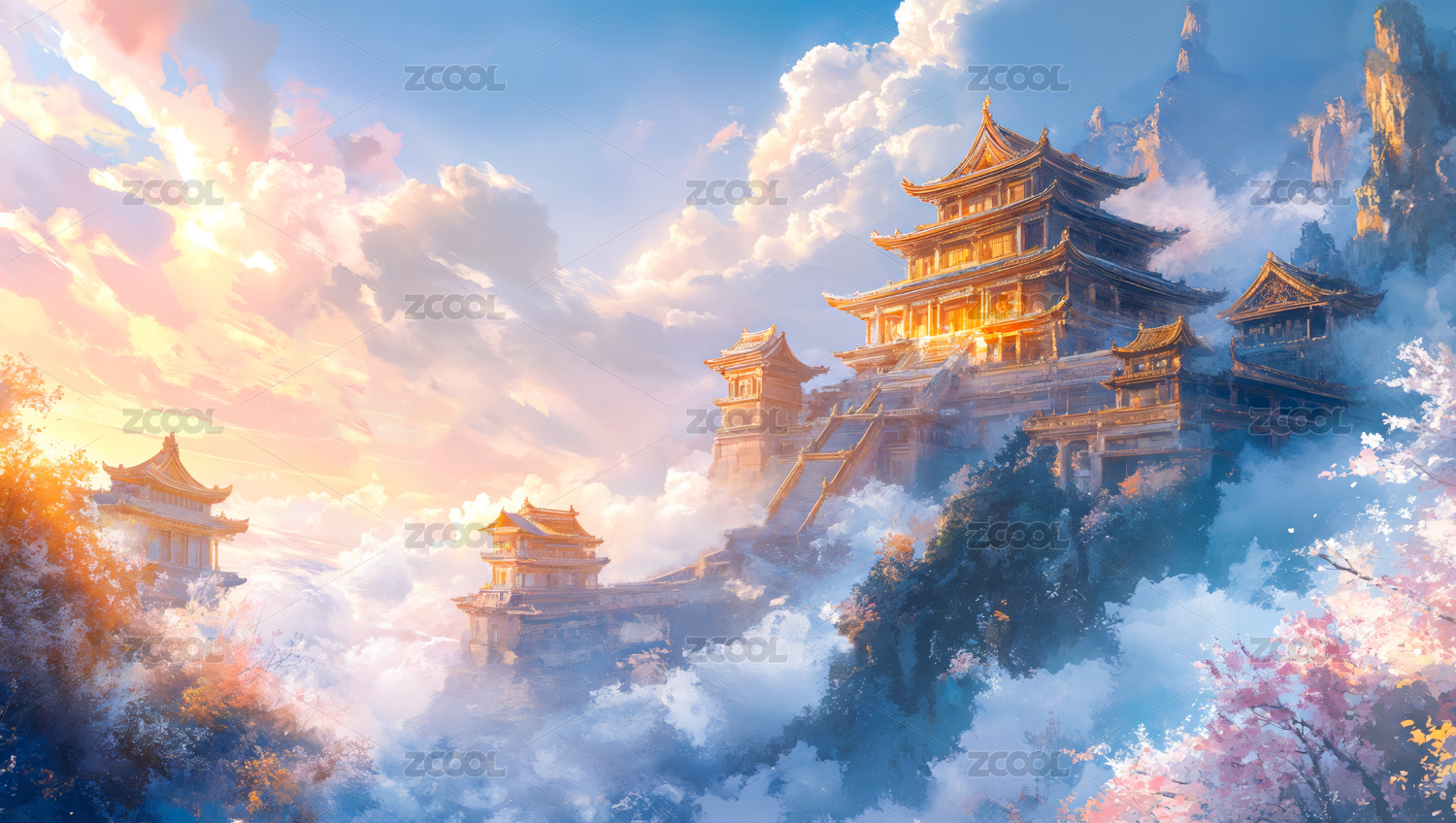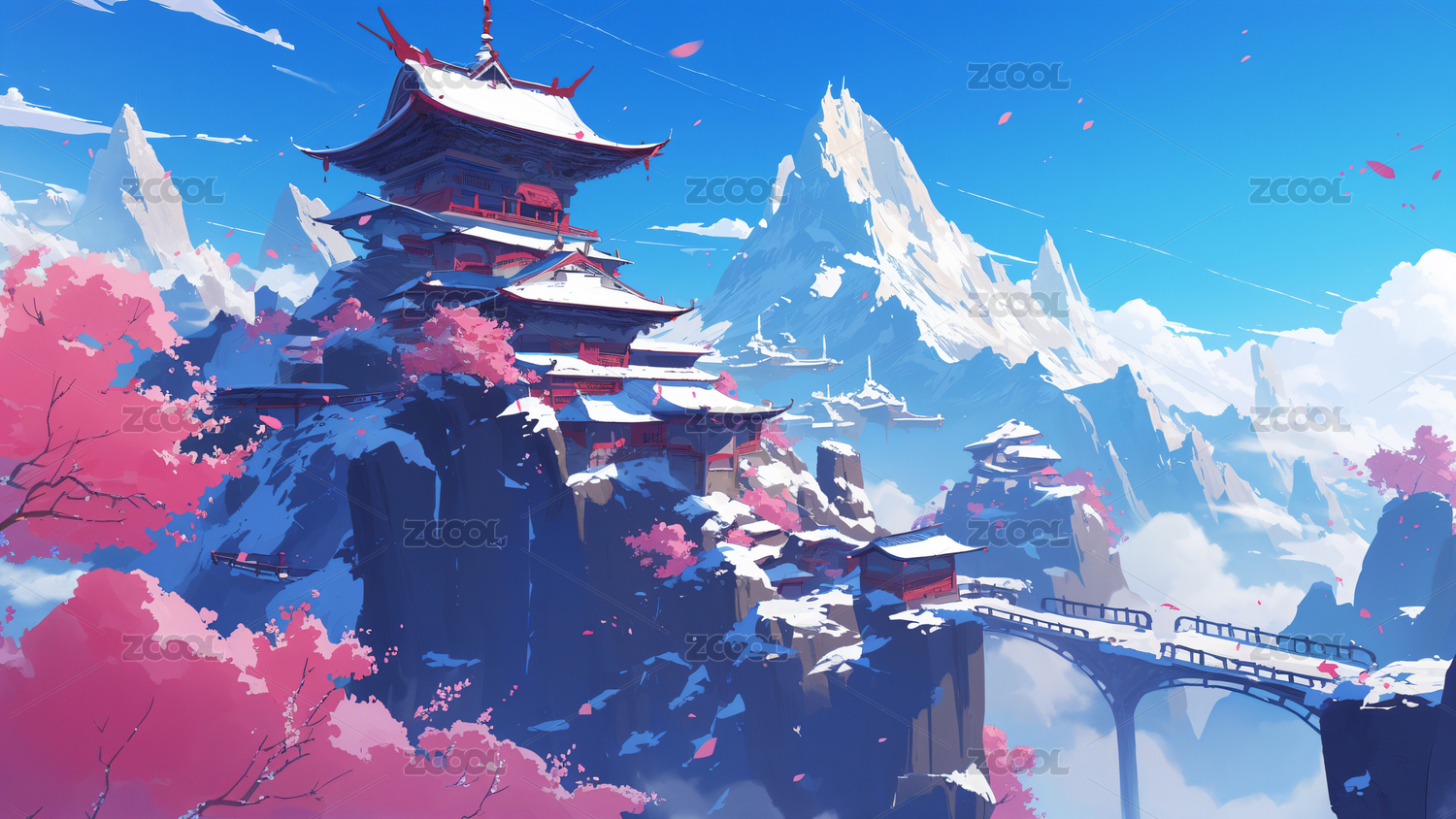 宫殿高山桃花自然风景插画
