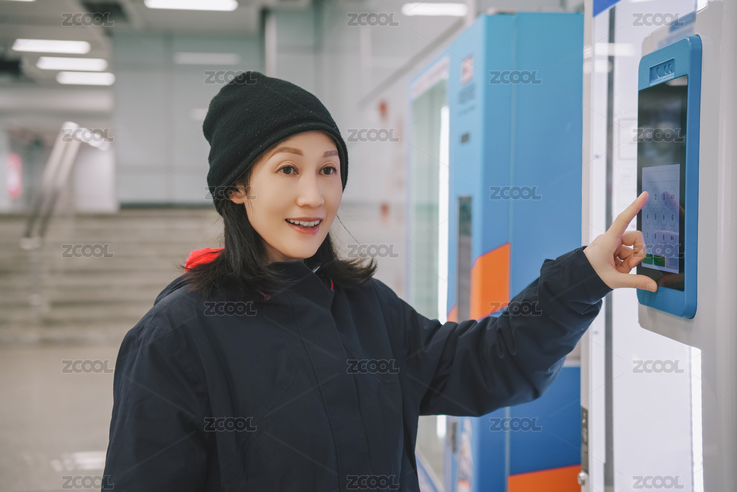 微笑的女人与交互式触摸屏显示器互动