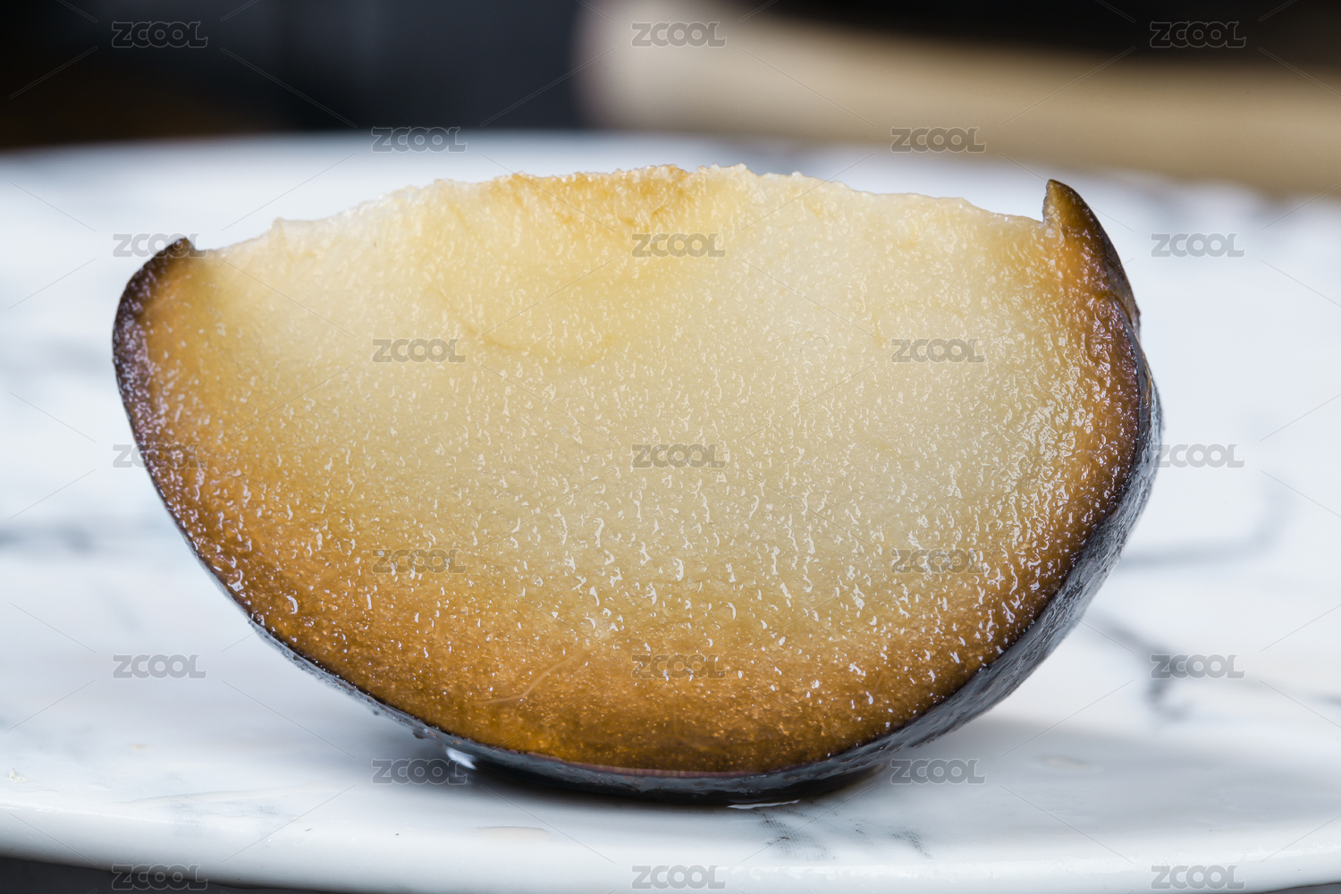 白石盘上放着一块冻梨果肉