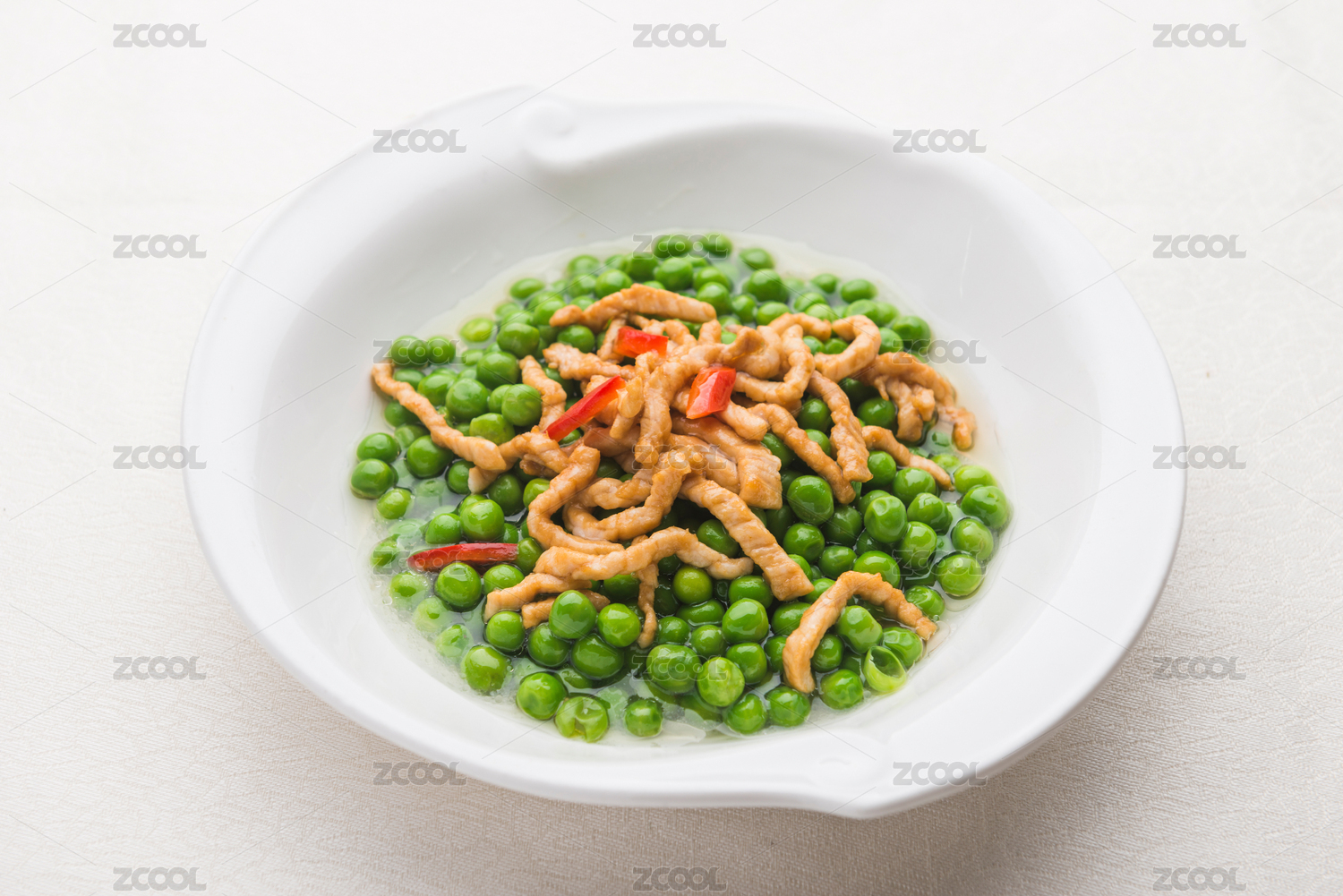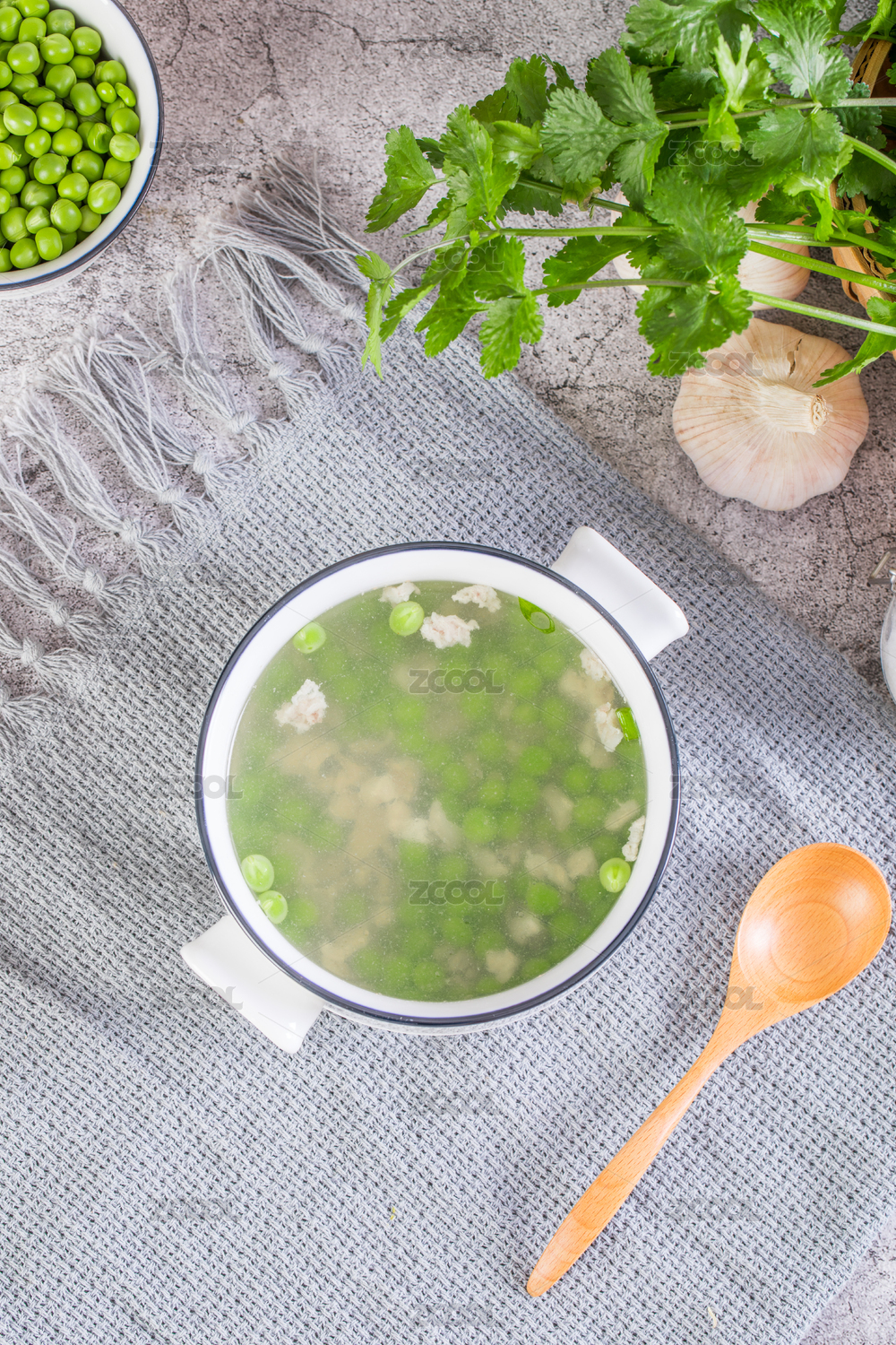 装着白瓷锅里的美味鲜甜的青豌豆瘦肉汤