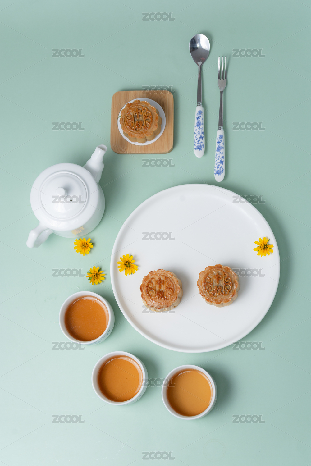 青底上白瓷盘盛装的中秋月饼及茶具餐具