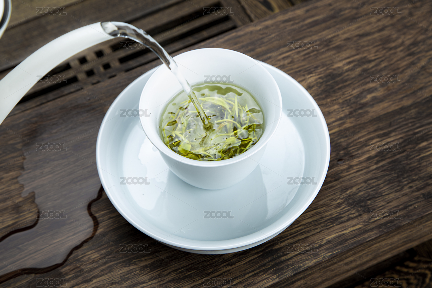 在重竹茶台上用影青白瓷盖碗注水冲泡特级信阳毛尖