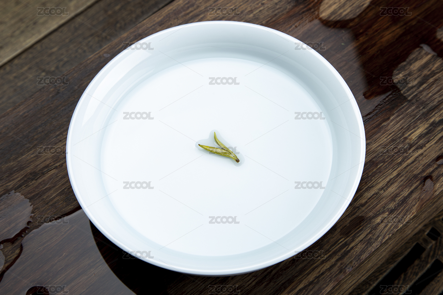 在重竹茶台上用影青白瓷圆盘展示特级信阳毛尖单个嫩芽叶底