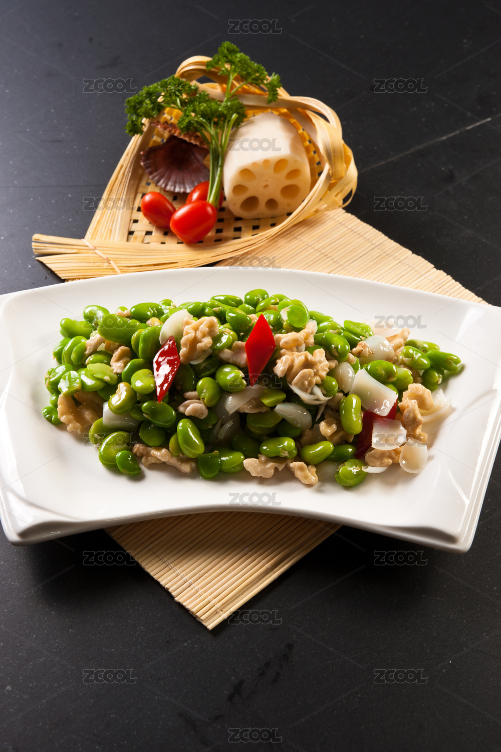 扇形白瓷盘装的青蚕豆桃仁炒百合
