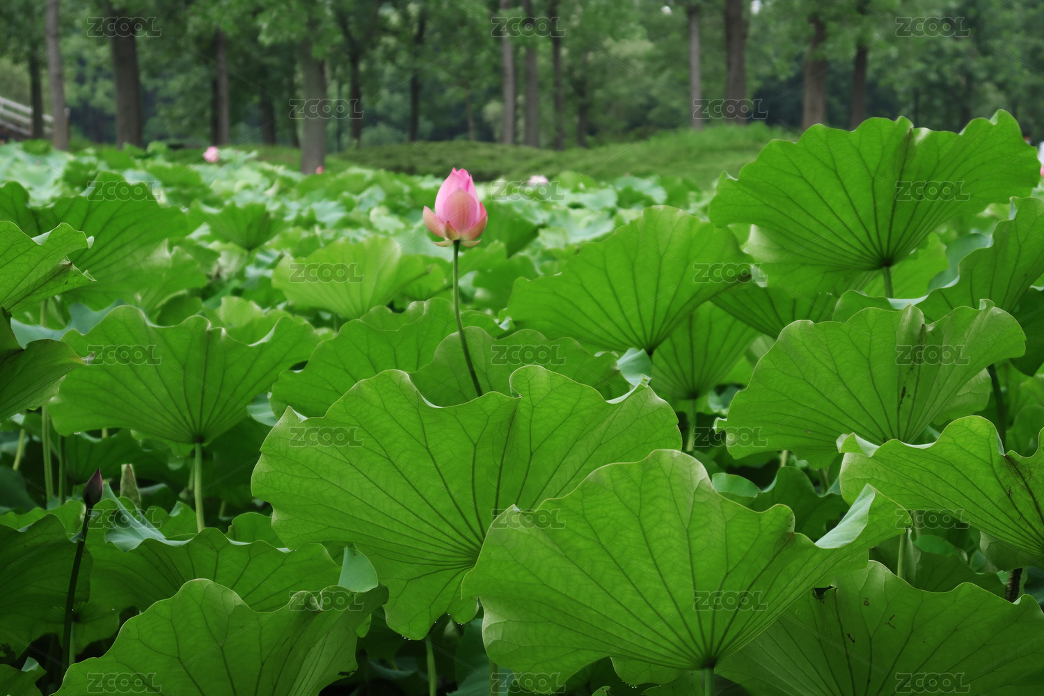 一朵荷花花苞直立在无穷莲叶中
