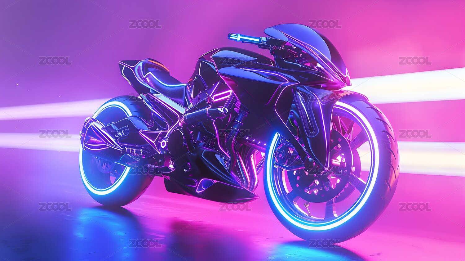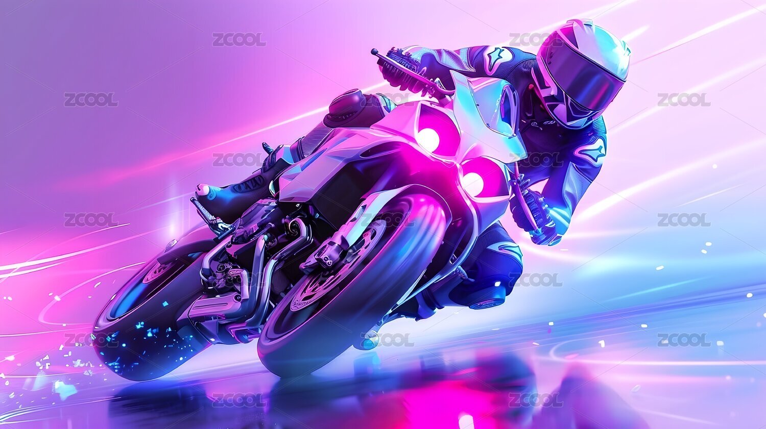 一个骑手骑着科技感摩托车在霓虹灯中行驶