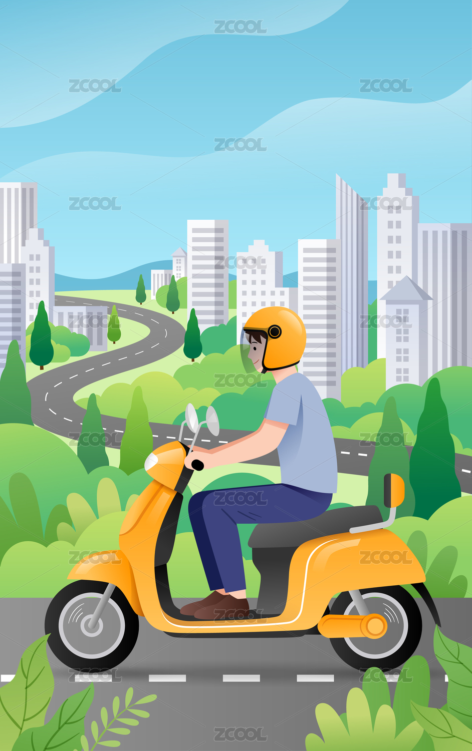 一个戴着头盔的男生在城市背景前骑摩托车