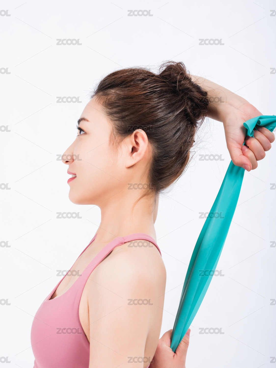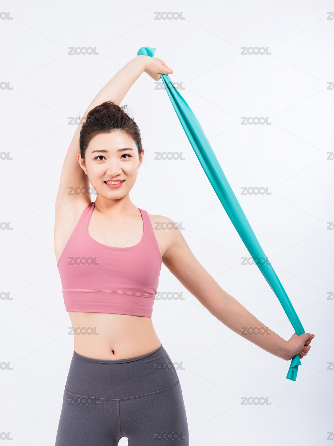 使用阻力带工具训练锻炼肌肉和个人健身教练教她美丽漂亮的女学生。