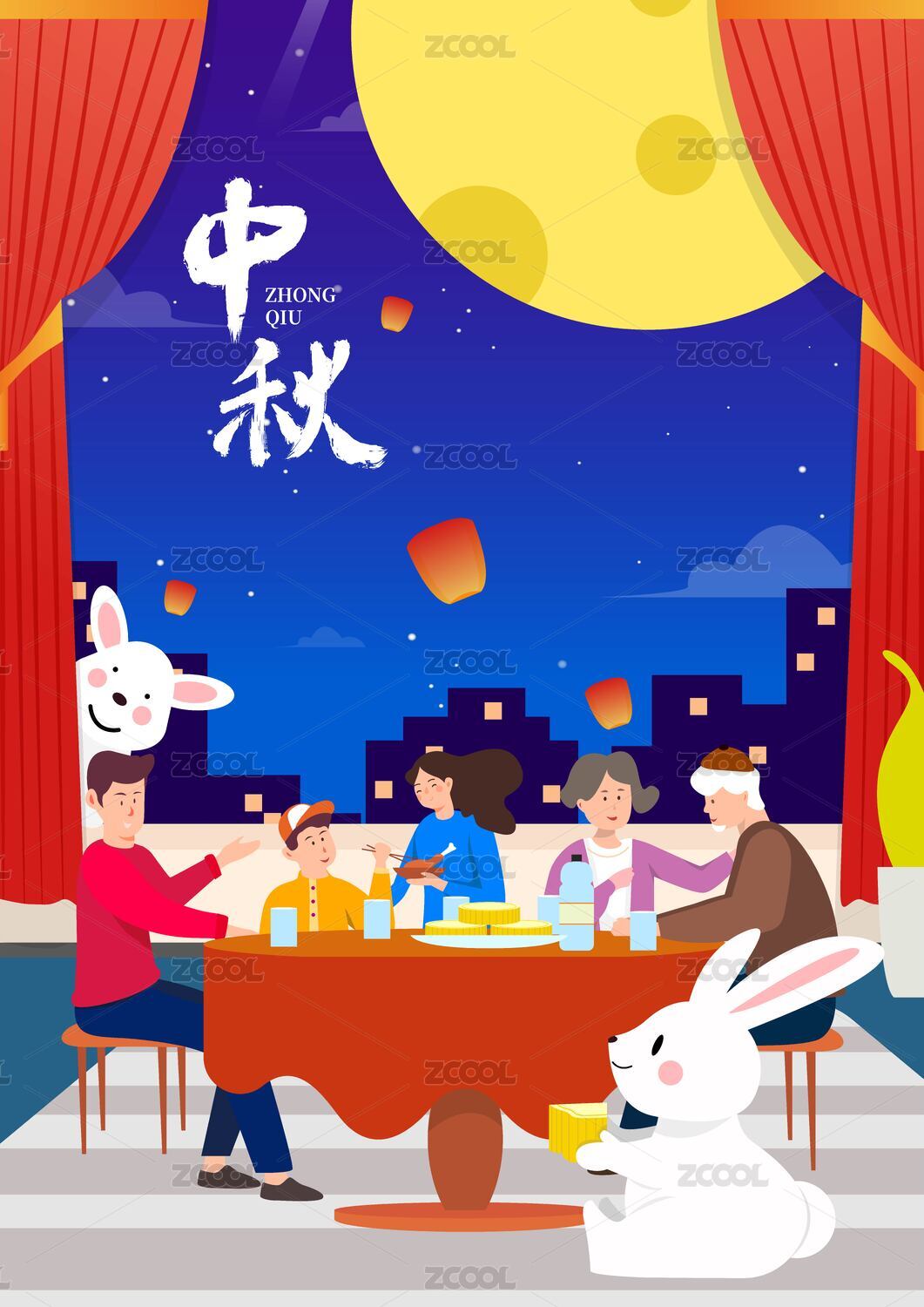 中秋节一家人团圆插画过年聚餐年夜饭海报
