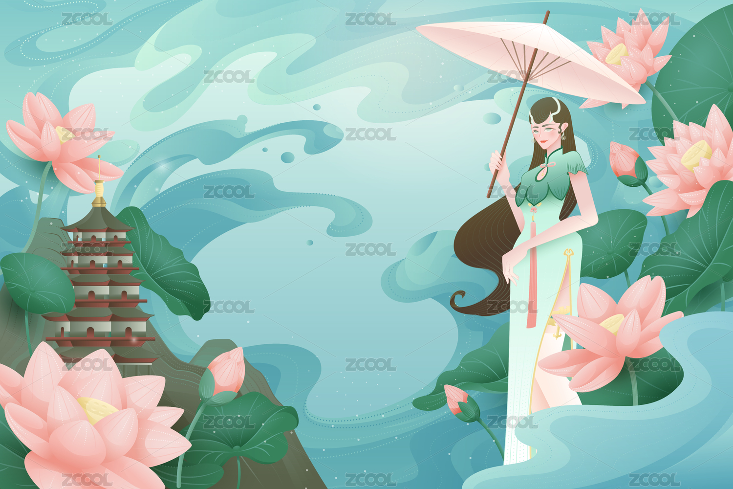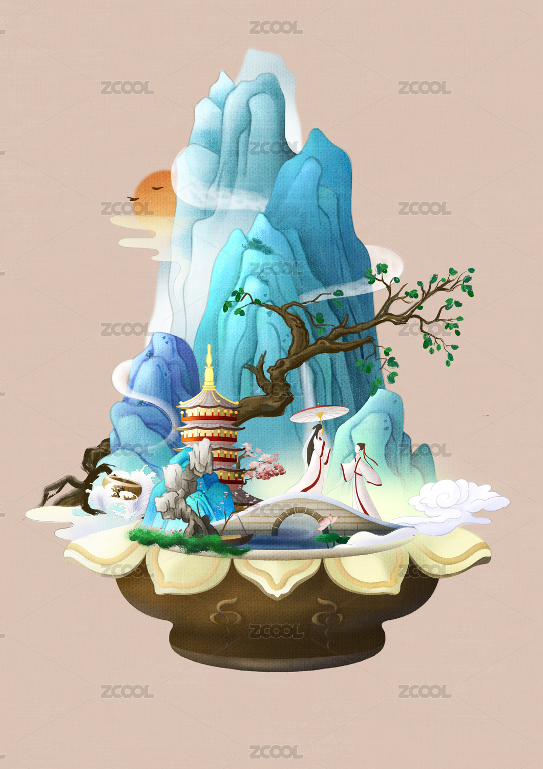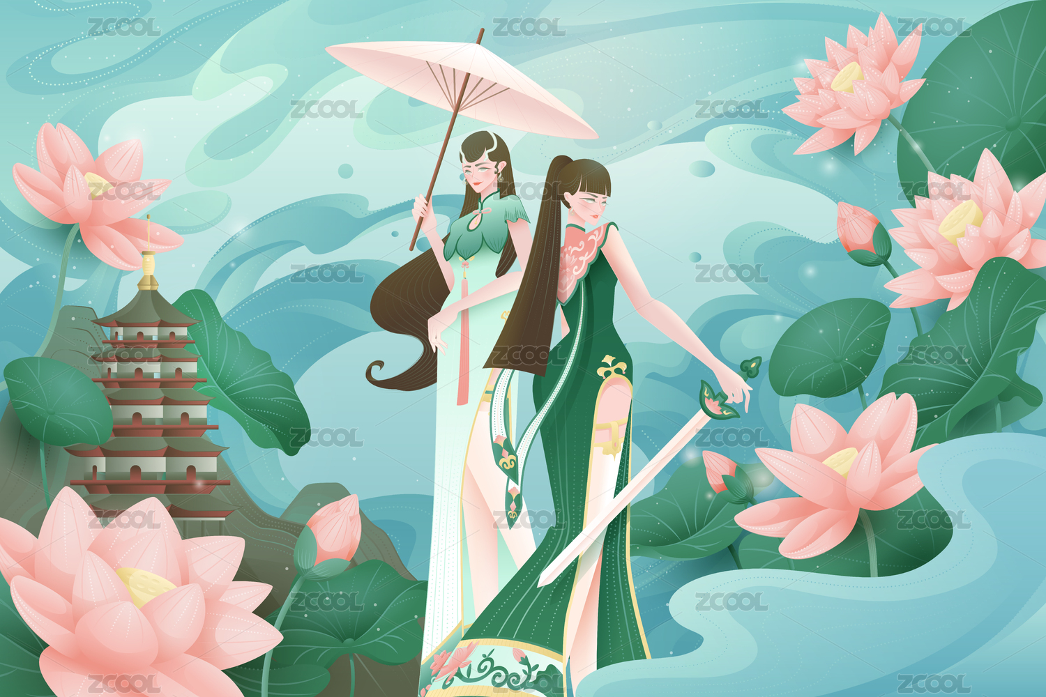 中国神话传说青蛇白蛇桃花山水国潮插画