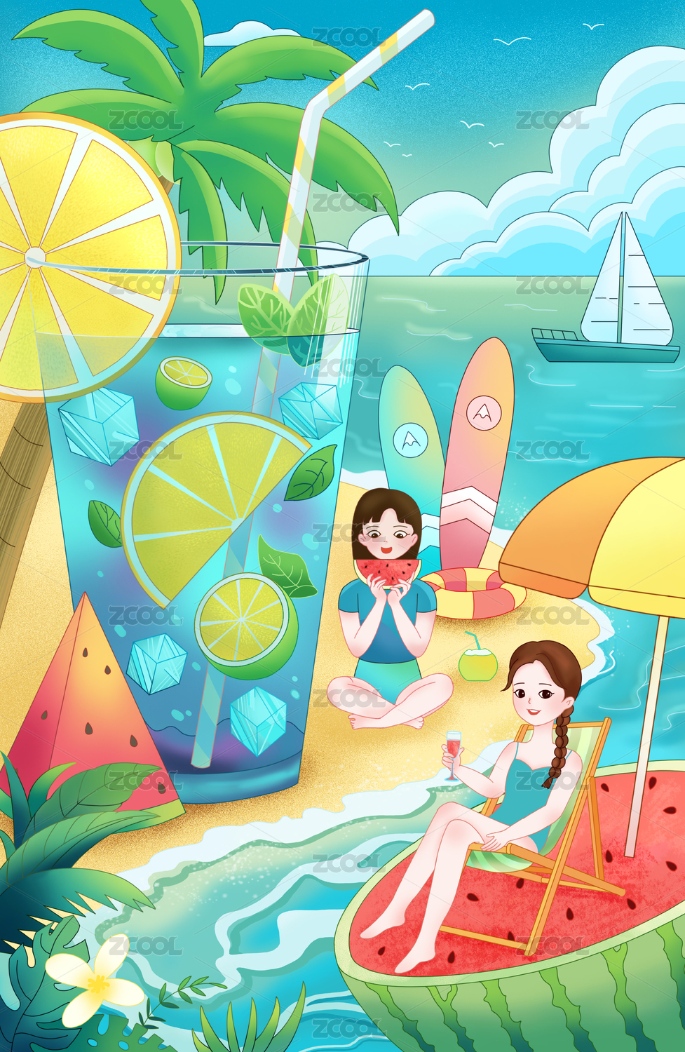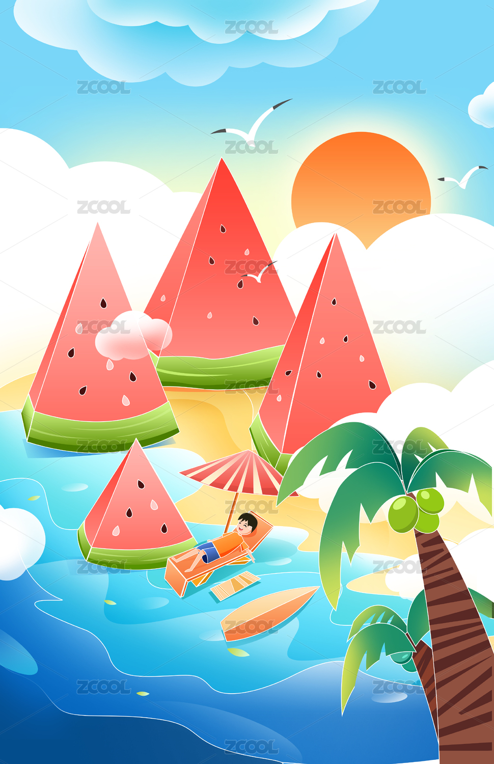 夏天大海冲浪清凉西瓜矢量插画