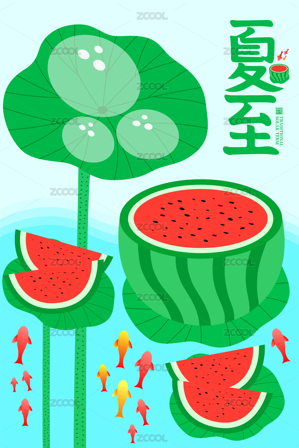 清新荷叶西瓜锦鲤夏至海报