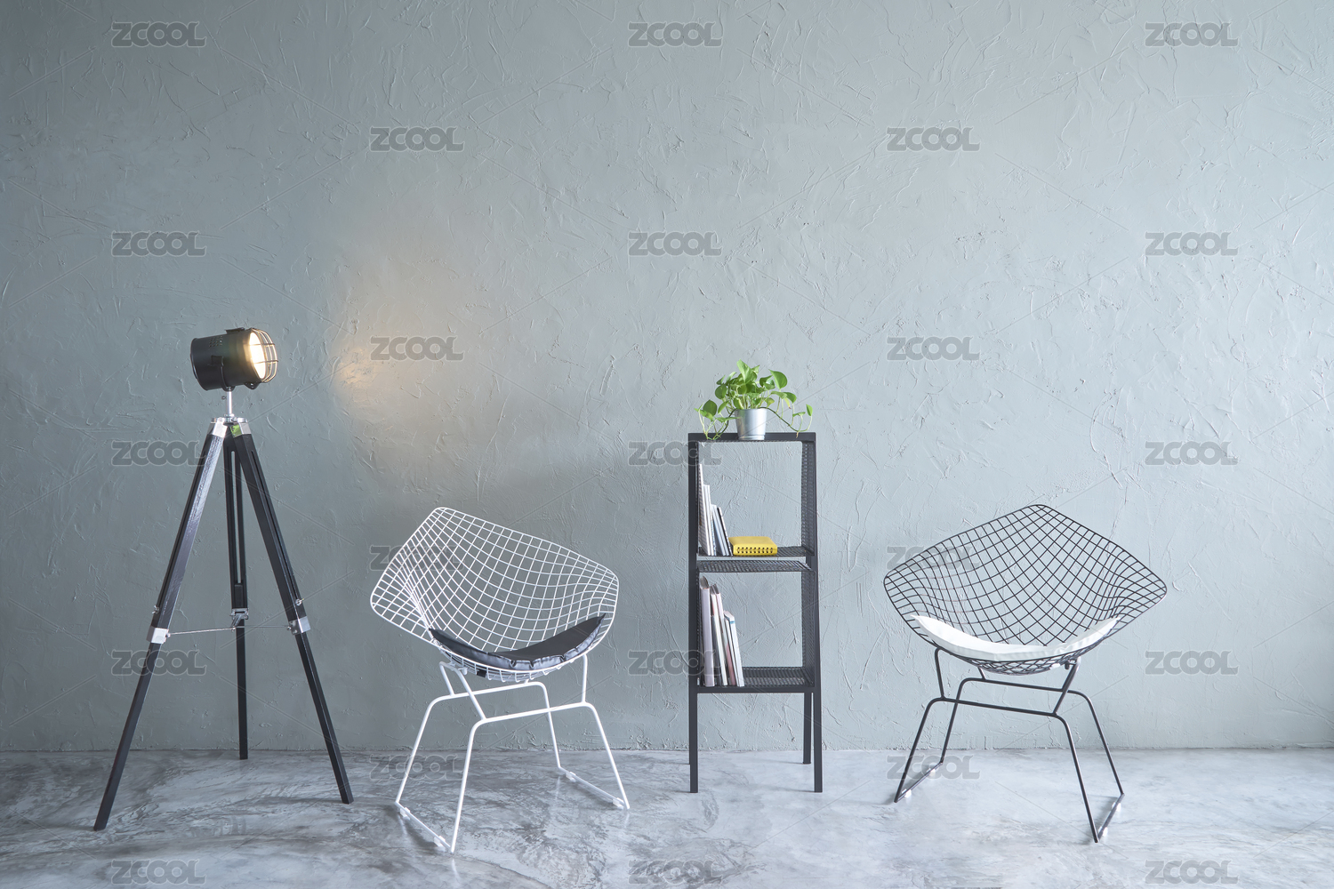 绿色植物,休闲铁椅和复古灯光摆设的现代客厅,水泥地板和混凝土墙,室内设计与Loft风格。
