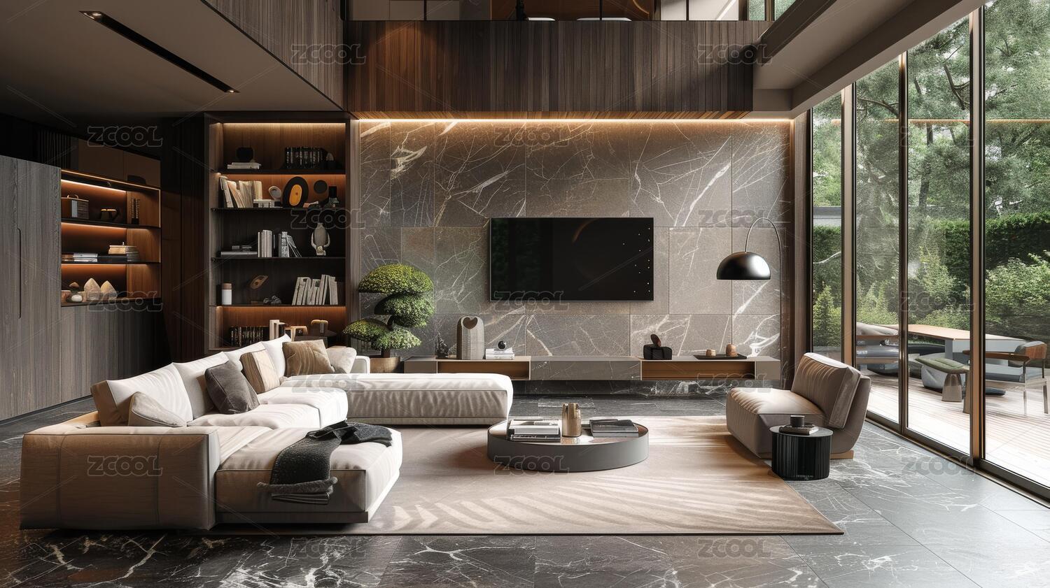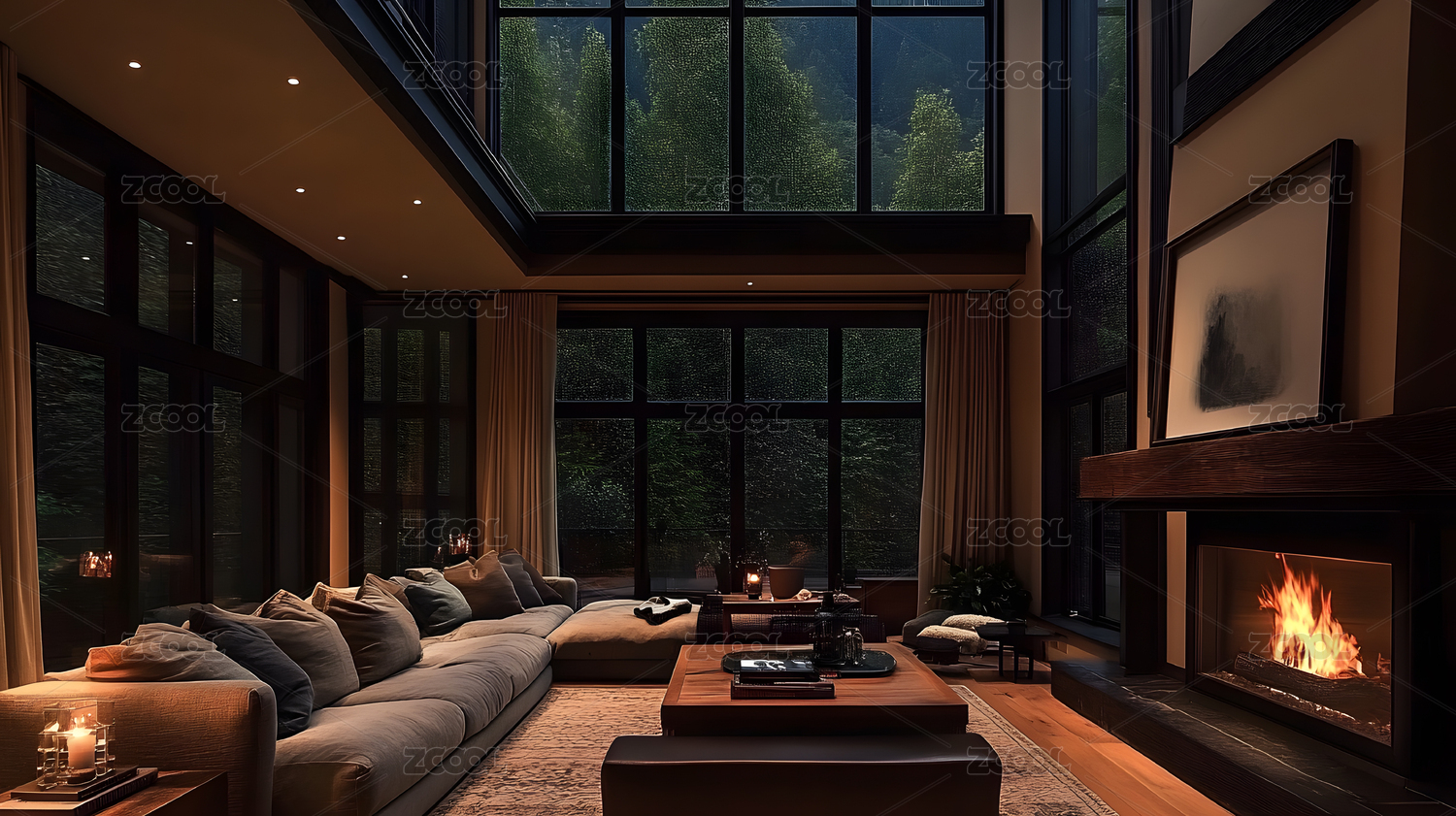 夜晚森林景观现代舒适客厅