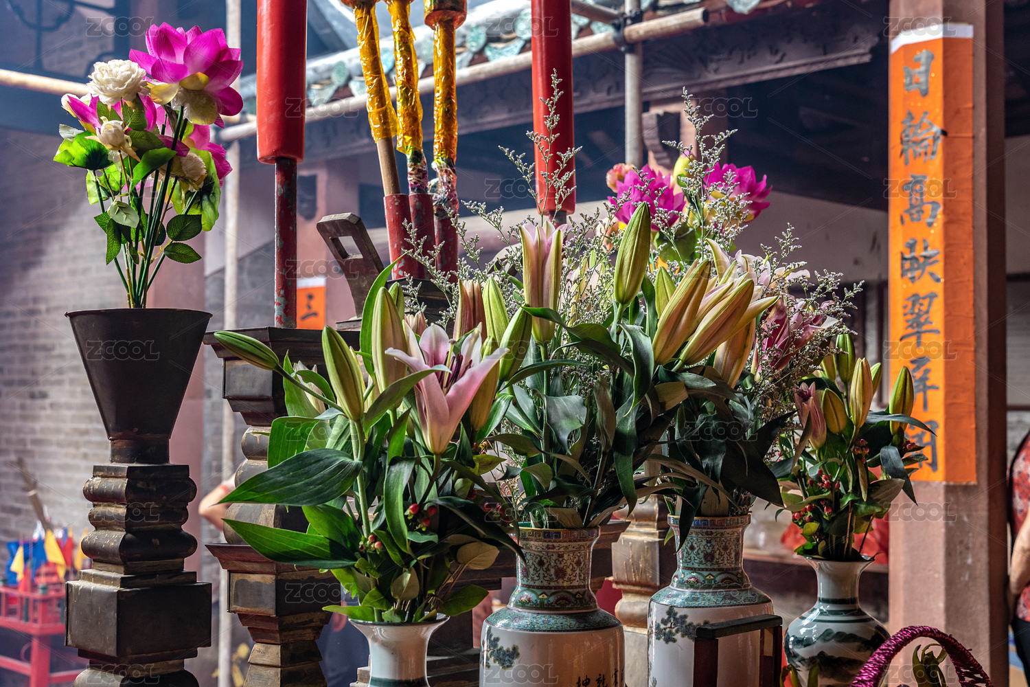 中国寺庙祭坛祭祀神灵的供品鲜花和香柱