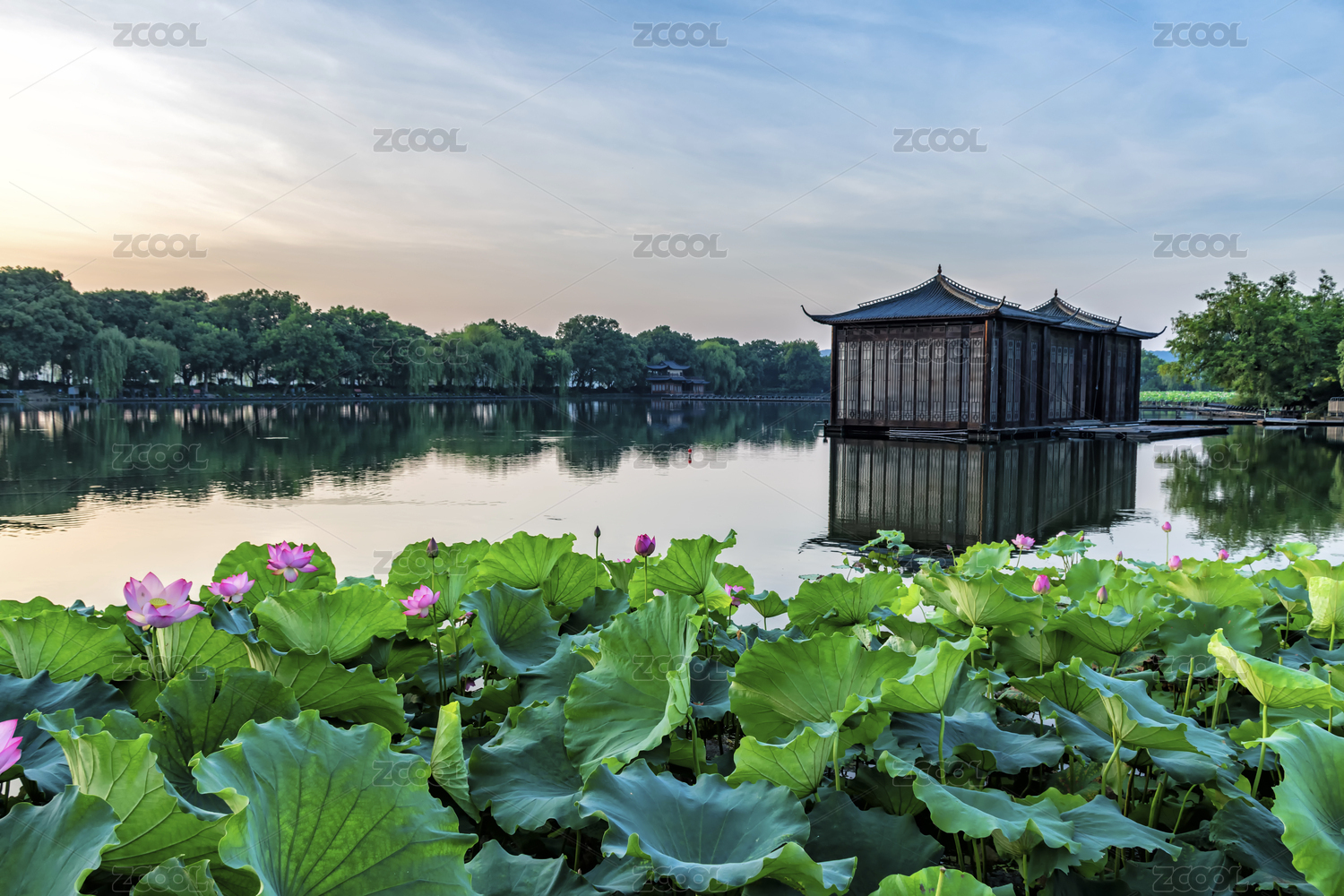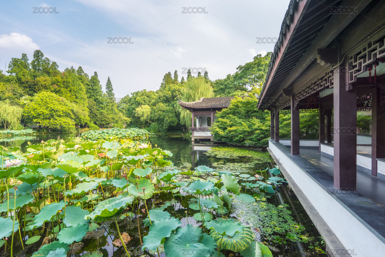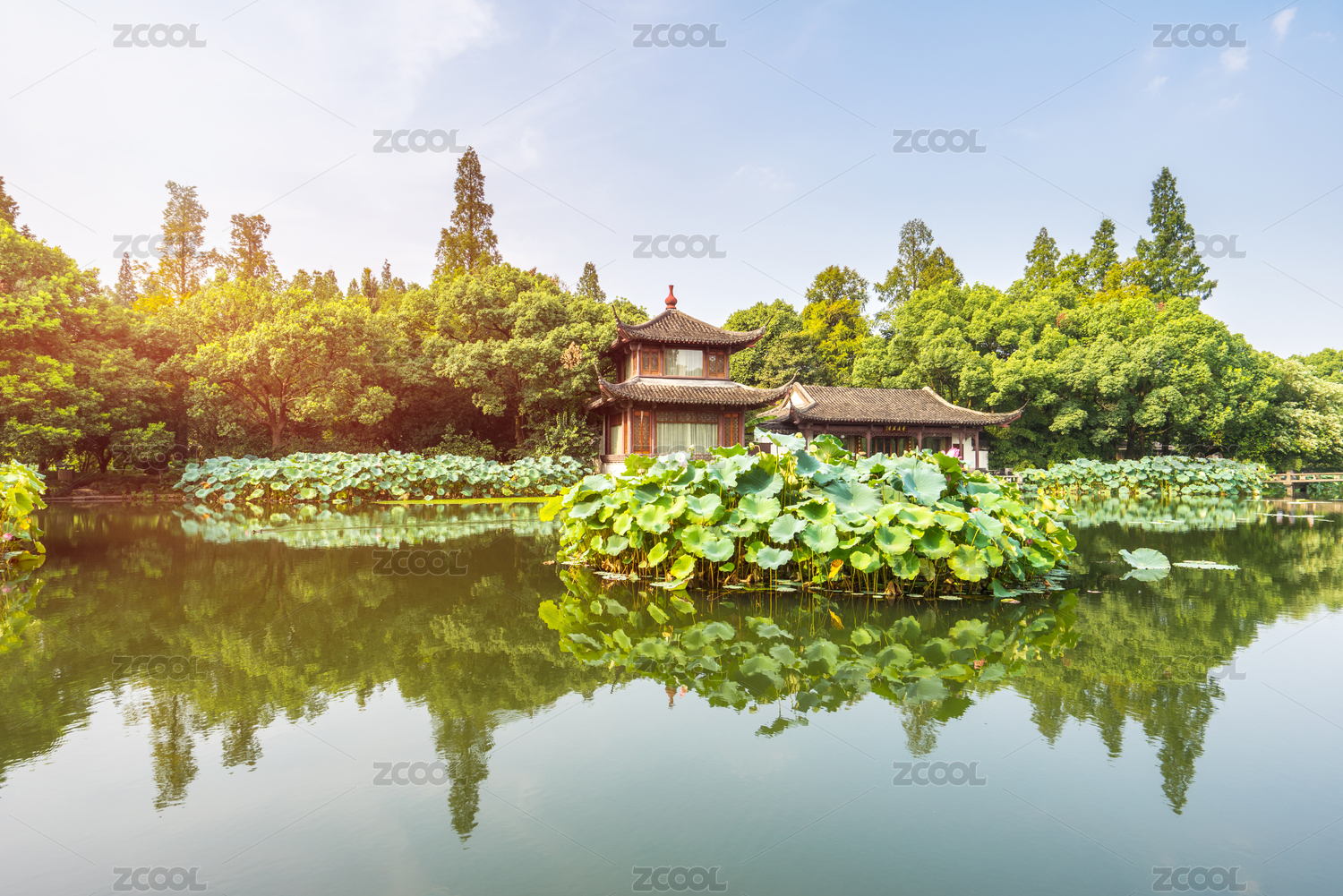 浙江省杭州西湖十景之一曲院风荷春季风光