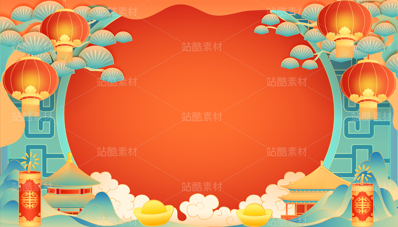 春节红灯笼松枝山天坛鞭炮建筑喜庆国潮背景