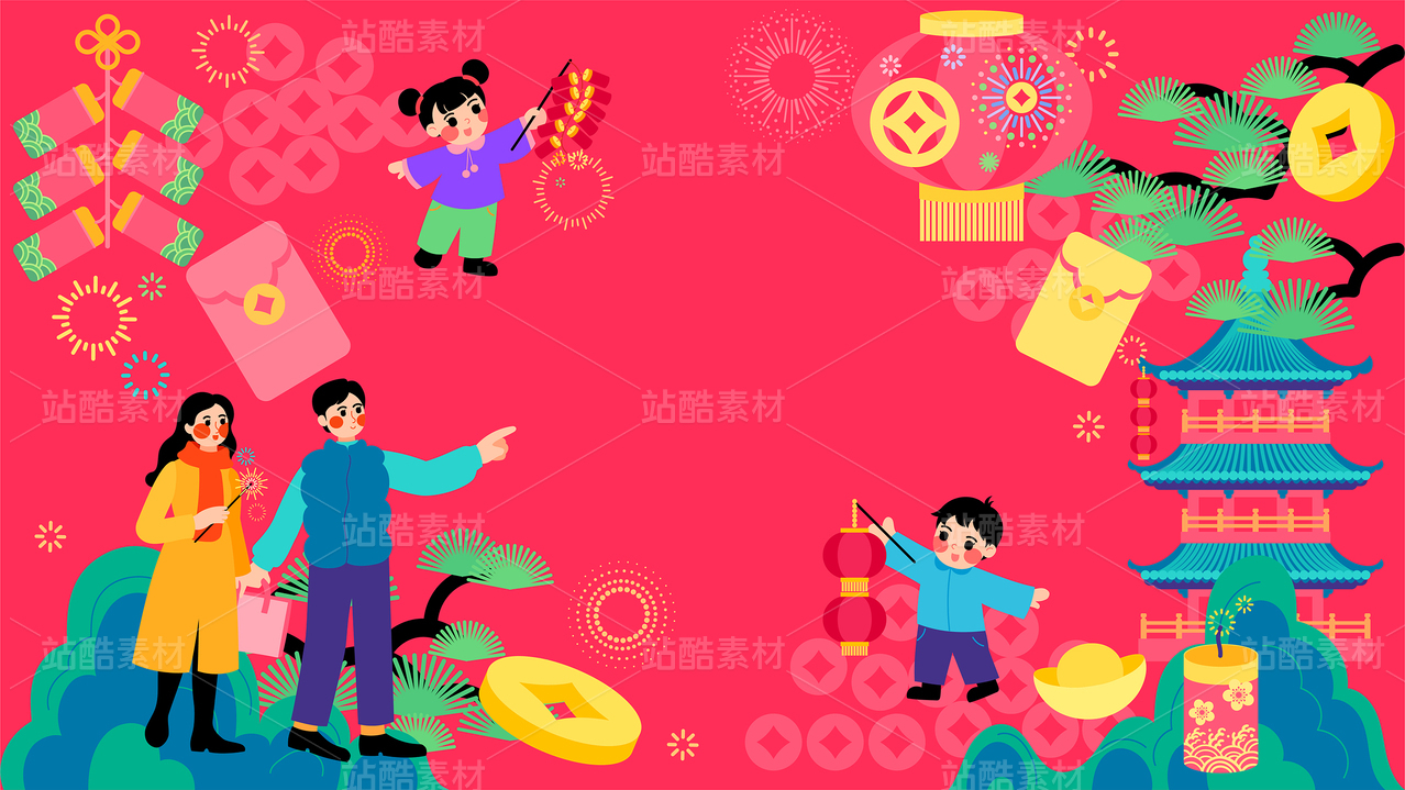 中国春节烟花一家四口灯笼古建筑松枝国风喜庆插画