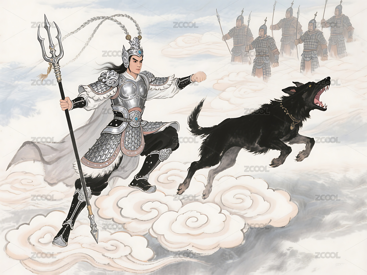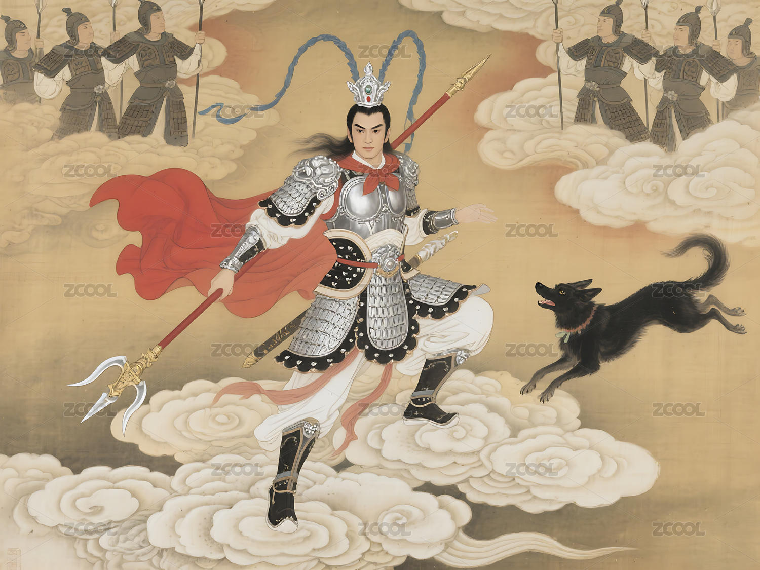 手持武器的二郎神和哮天犬