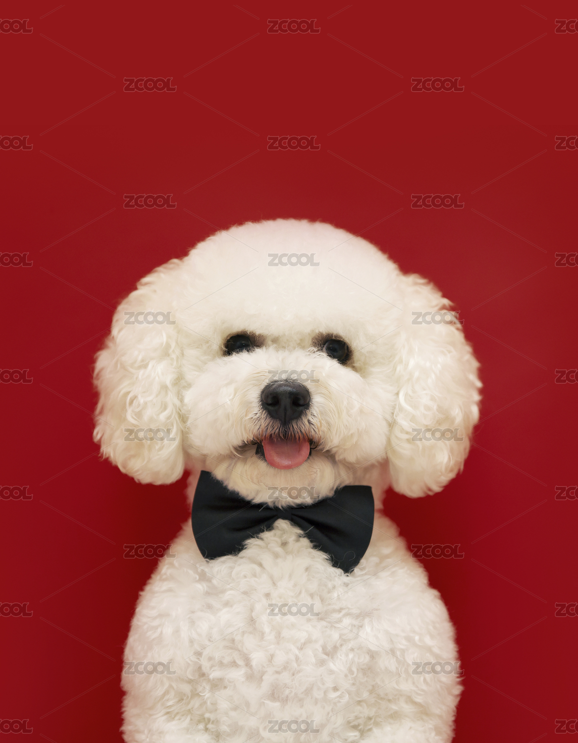 沙滩上玩耍的伸着舌头的白色卷毛比熊犬