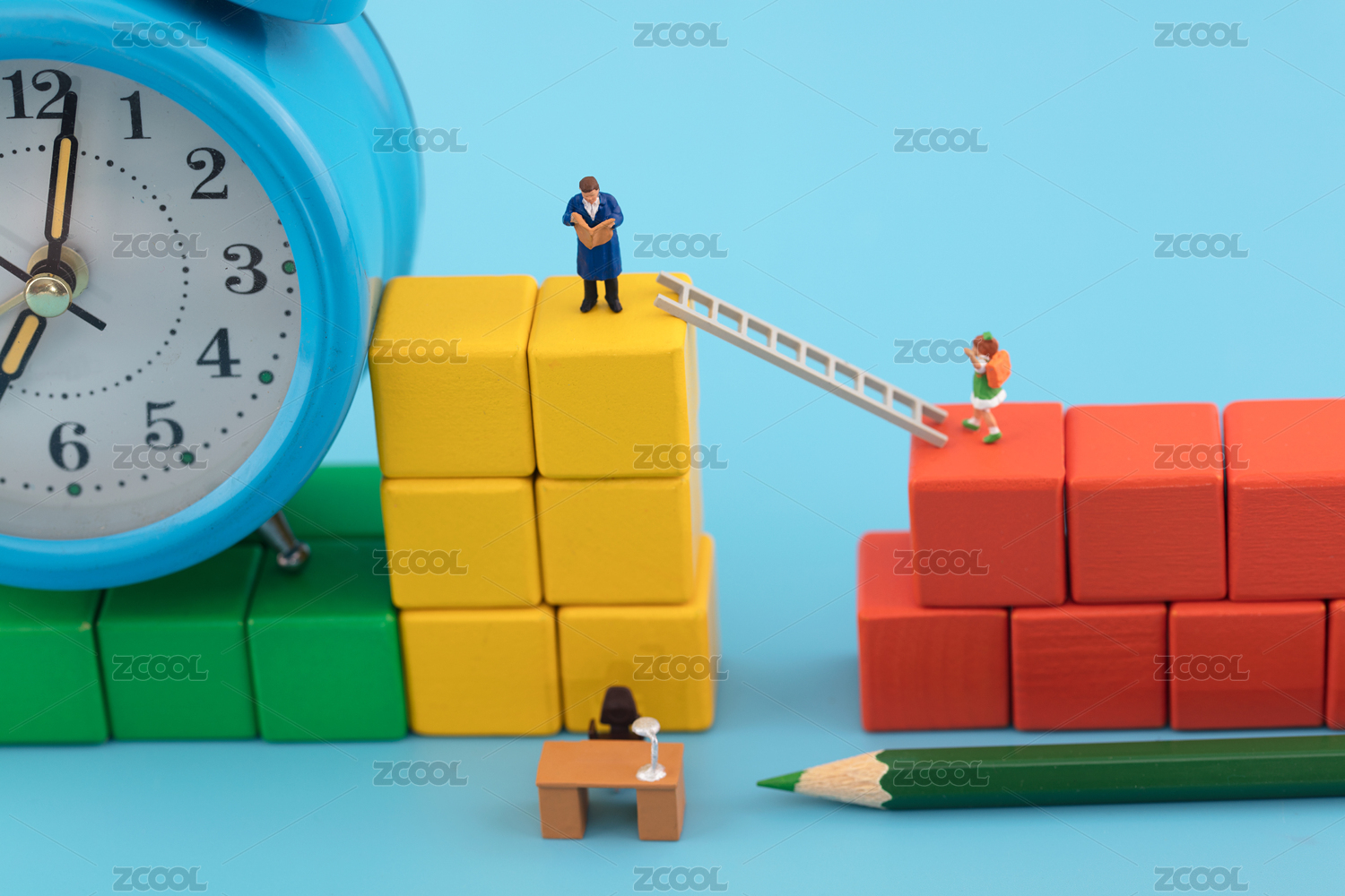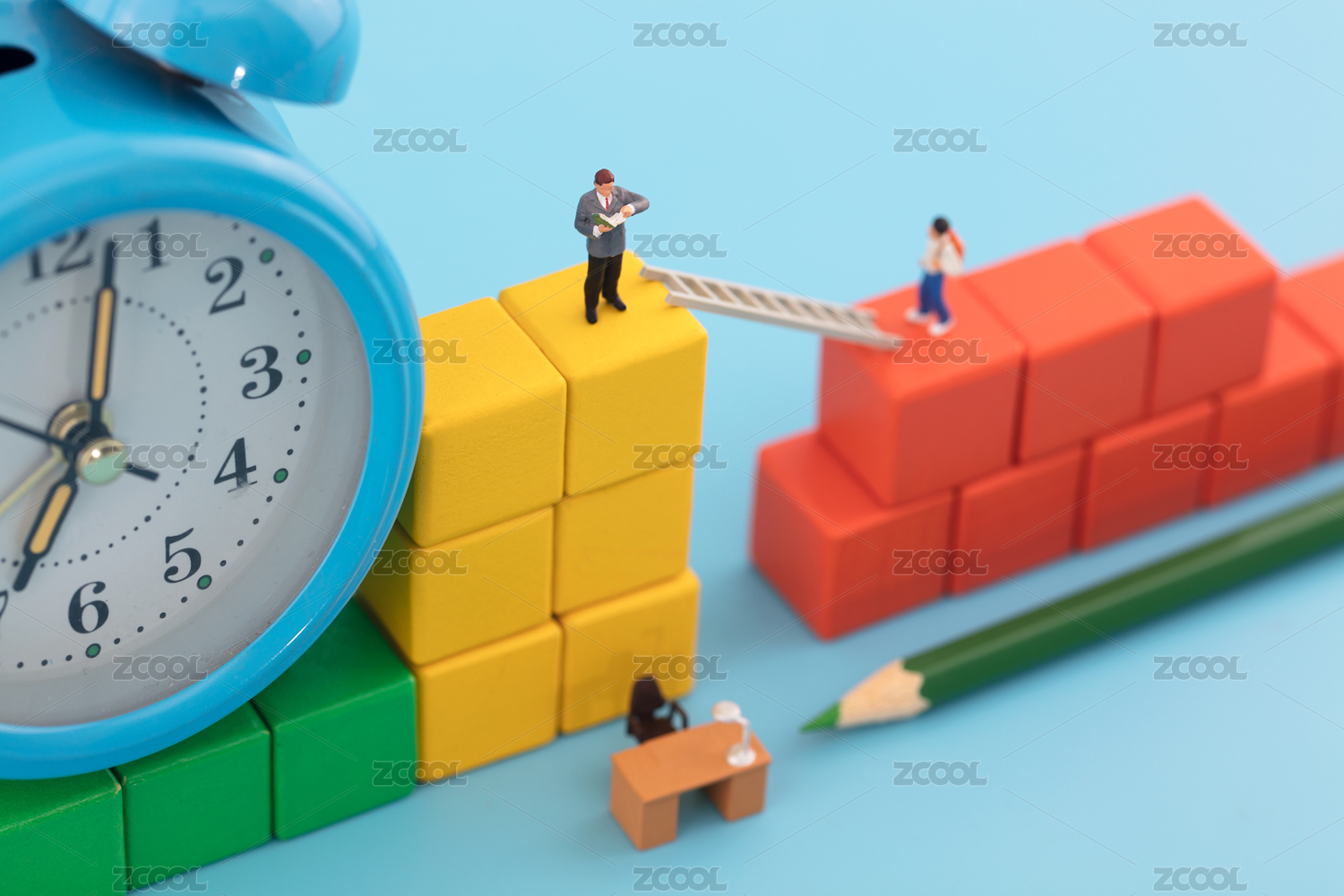 商人站在通过积木顶端的梯子旁
