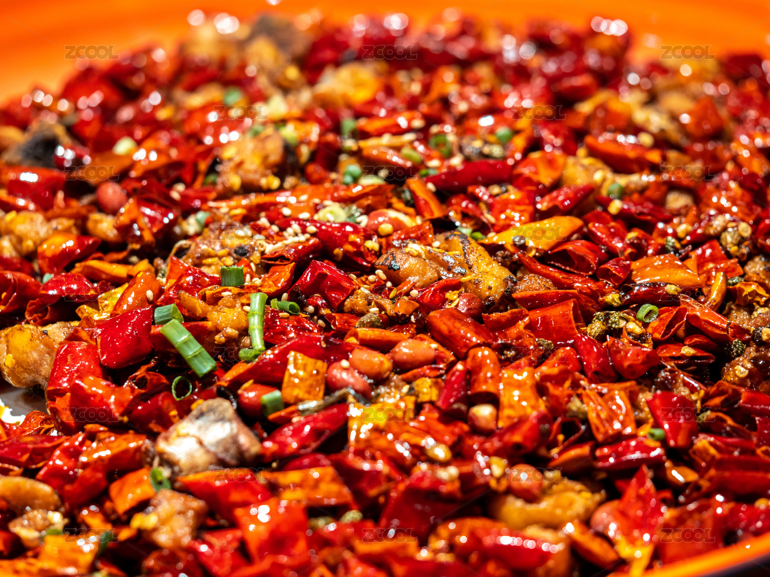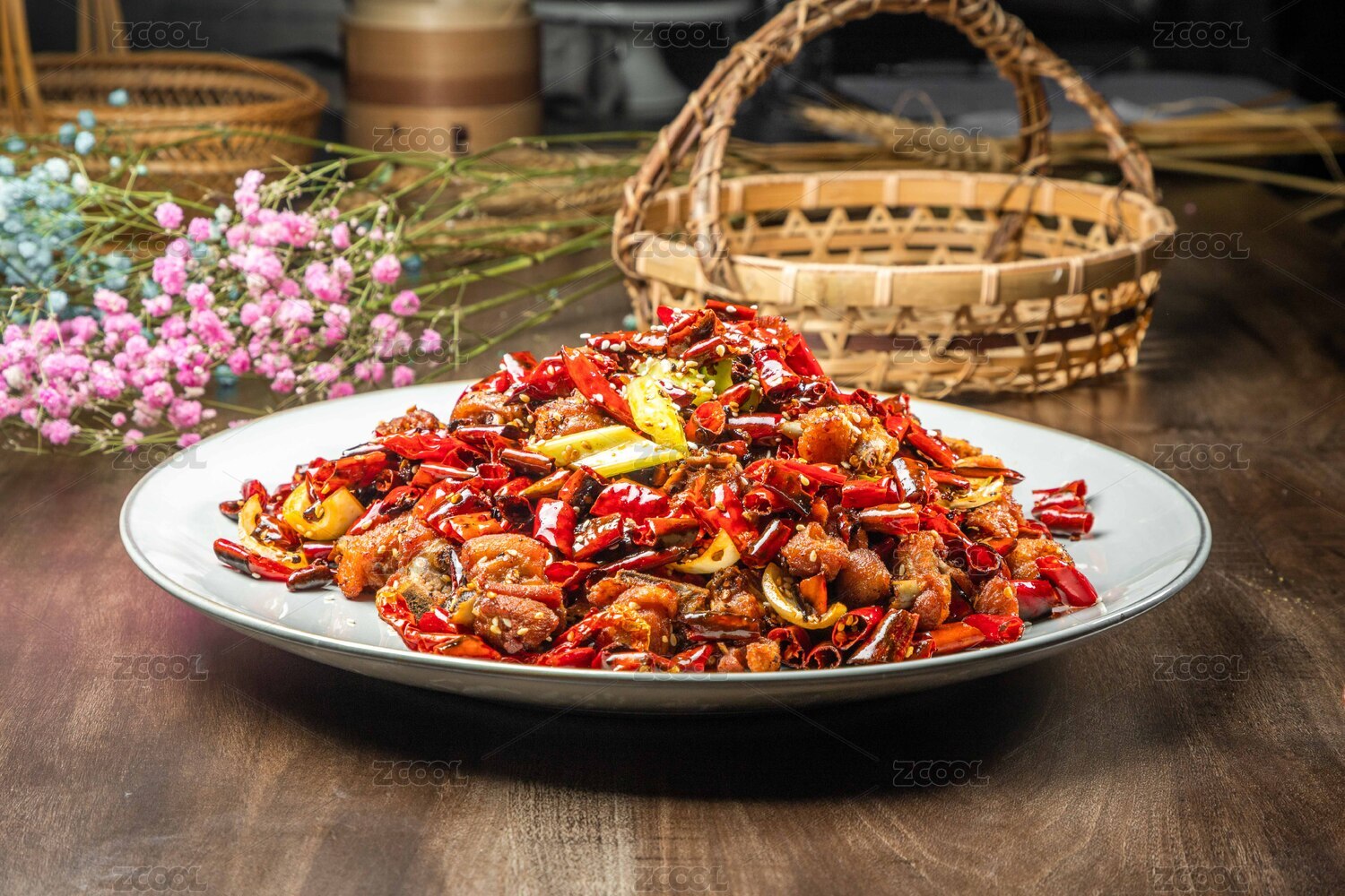 灰色背景上暗红色陶盘中的川香辣子鸡