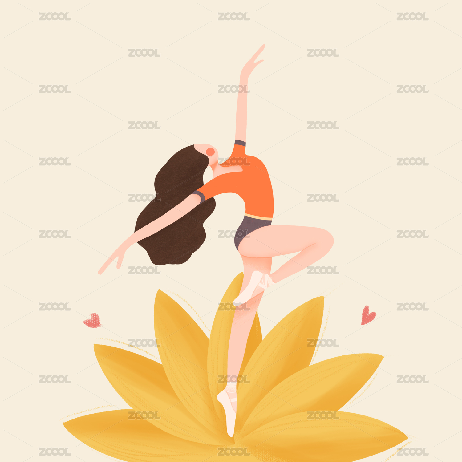 穿着舞鞋的长发女性在花朵中间舒展舞蹈