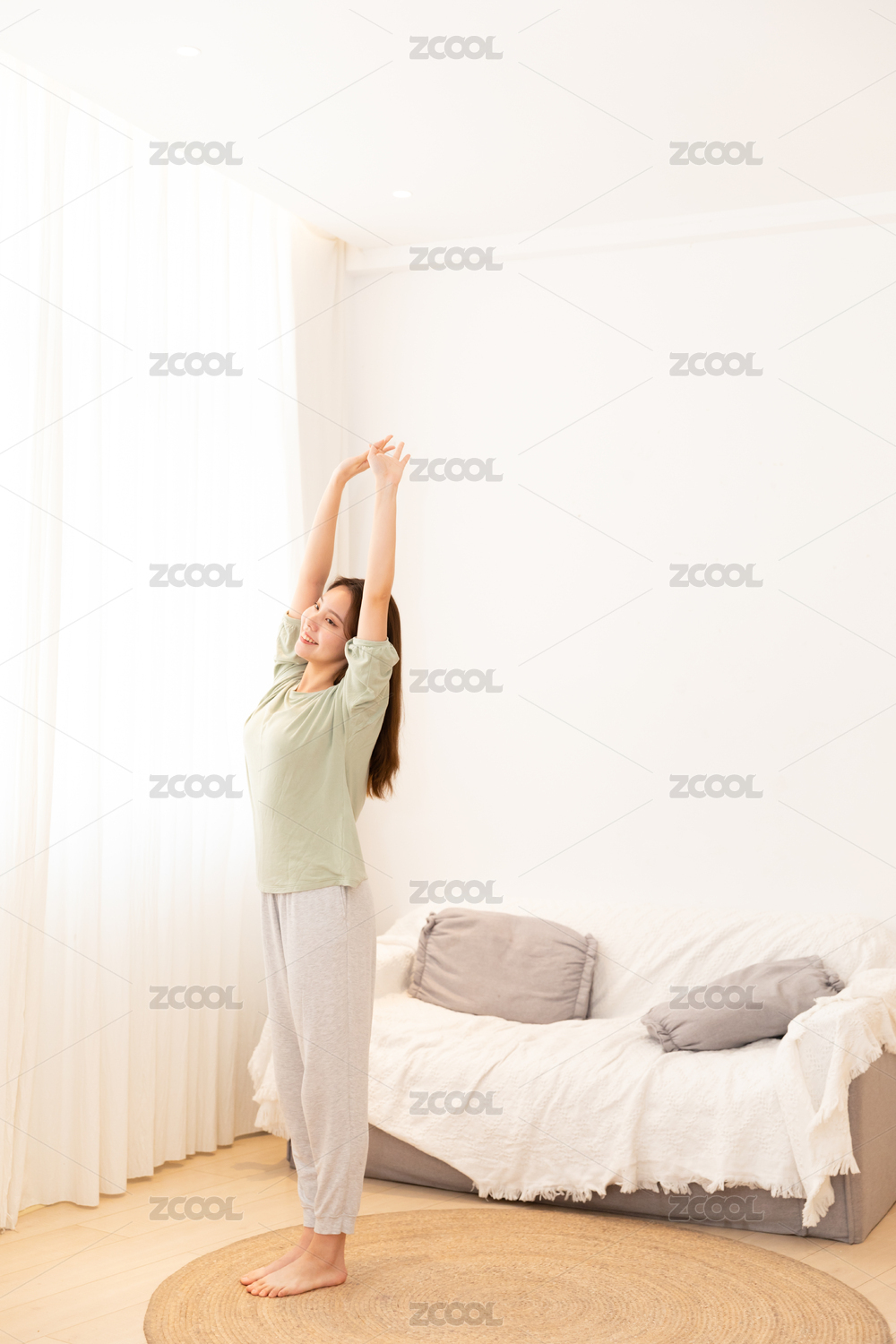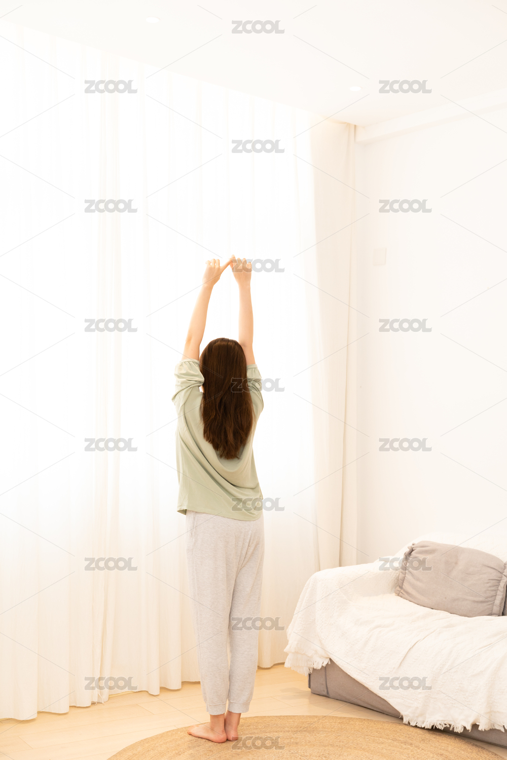 居家女性站在窗前舒展肢体放松身体全身