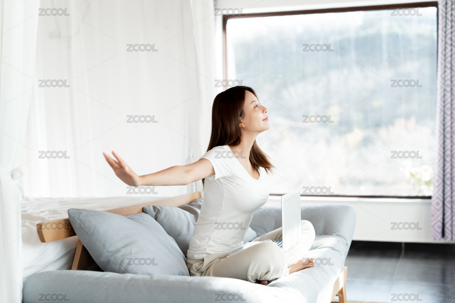 女孩在床上舒展手臂