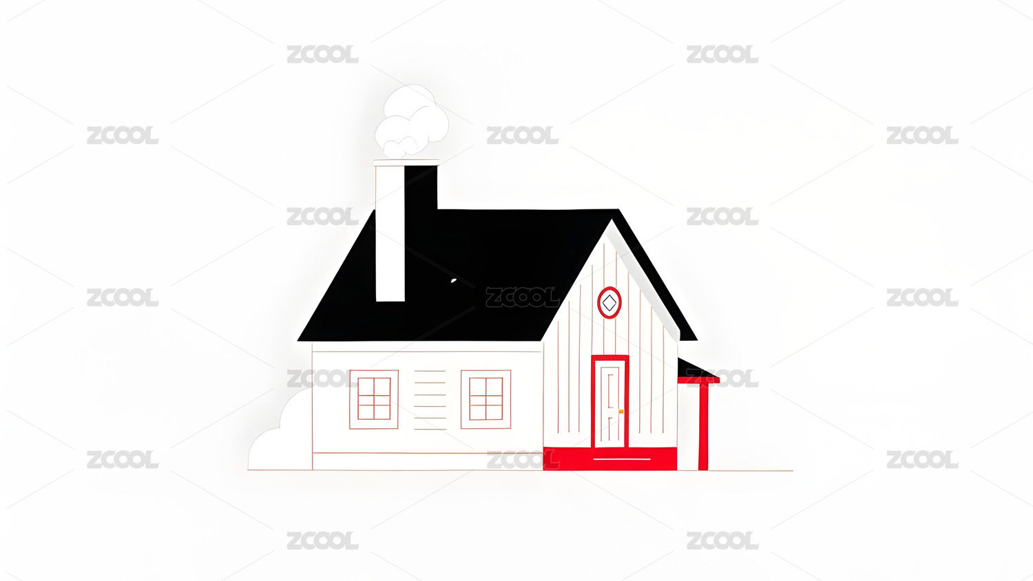 红门白墙黑屋顶小屋冒烟