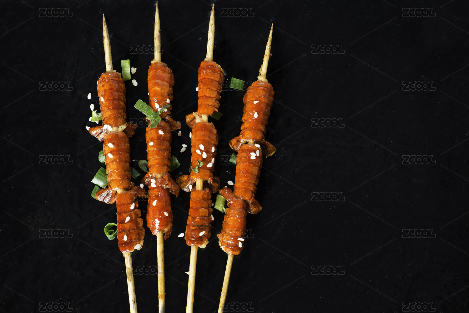 黑色背景上的4串烤虾尾