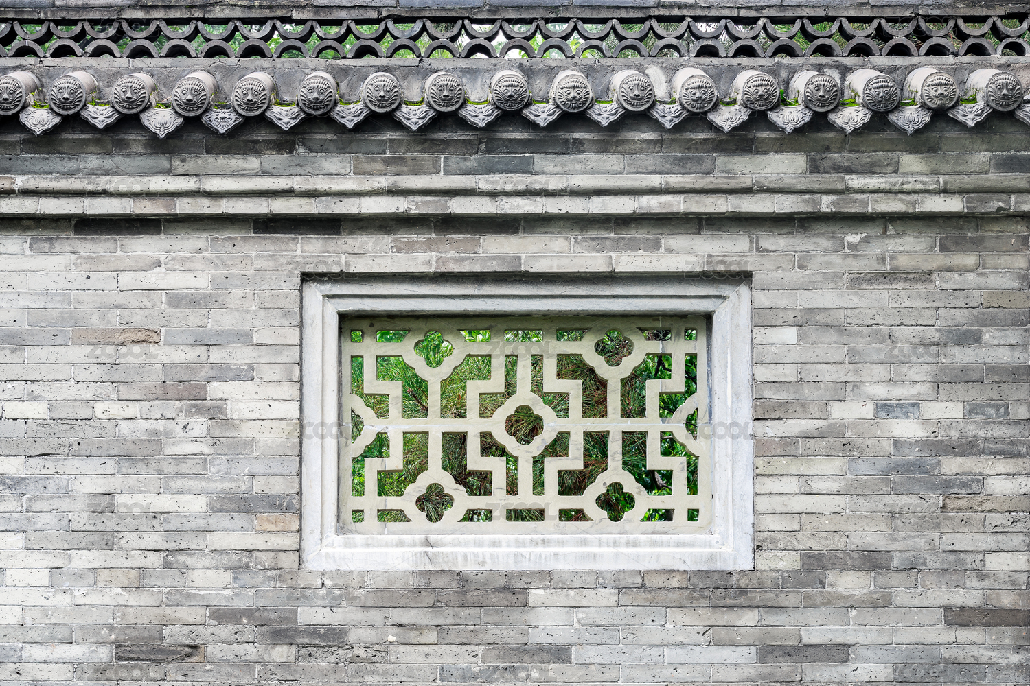 中国山西省太原市晋祠灰瓦青砖漏窗围墙