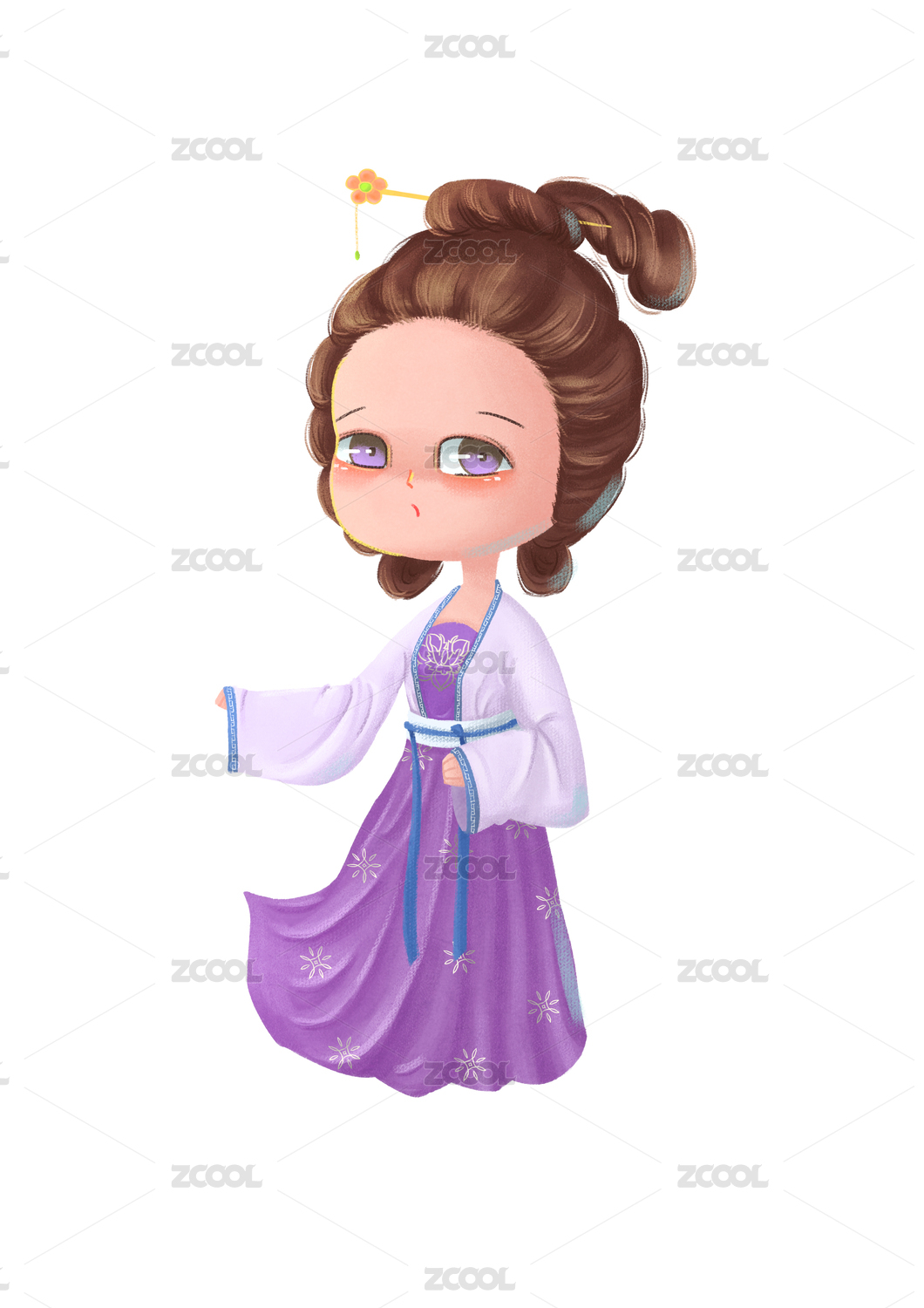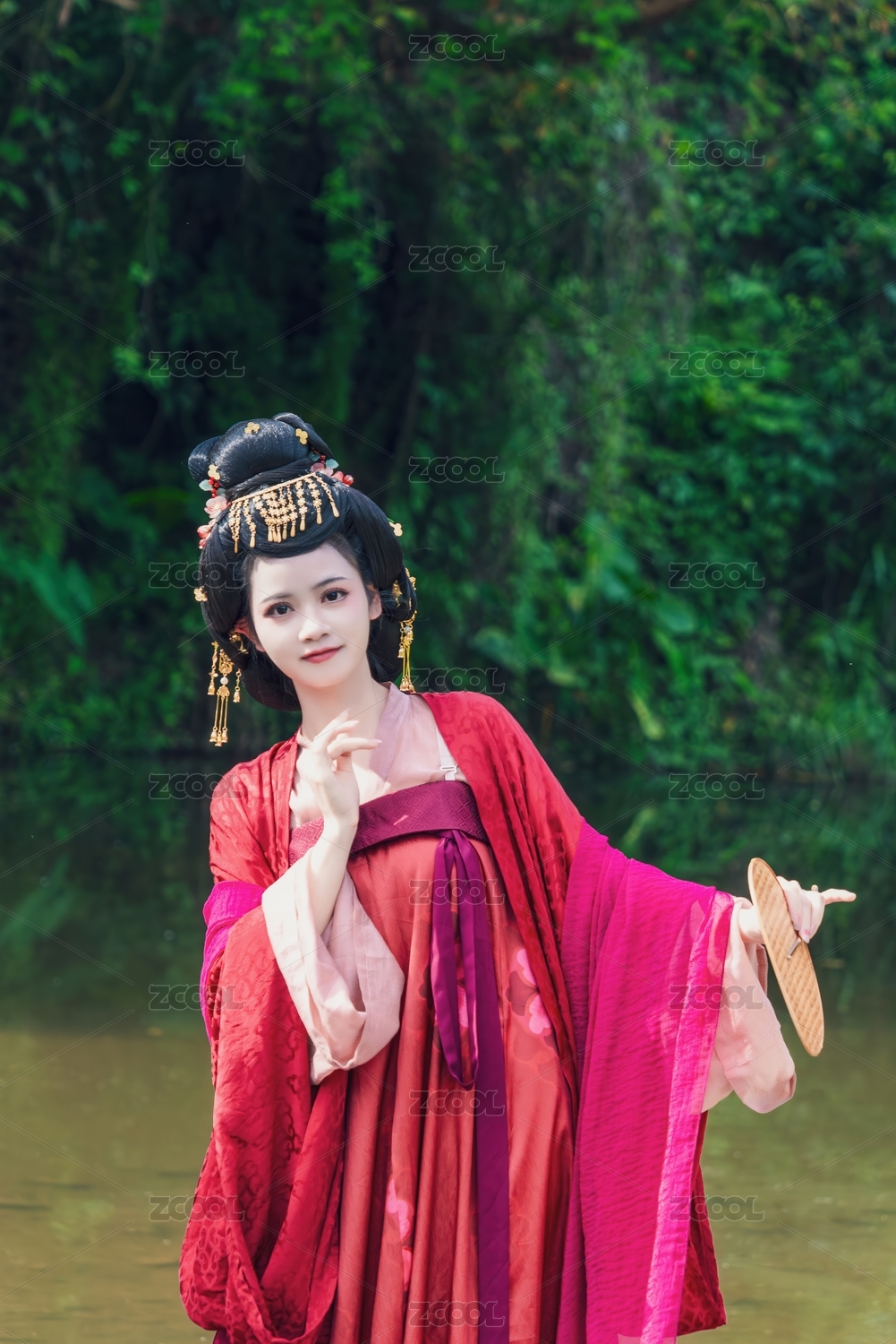 一个穿橘色大袖衫绿色长裙梳着发髻的女孩