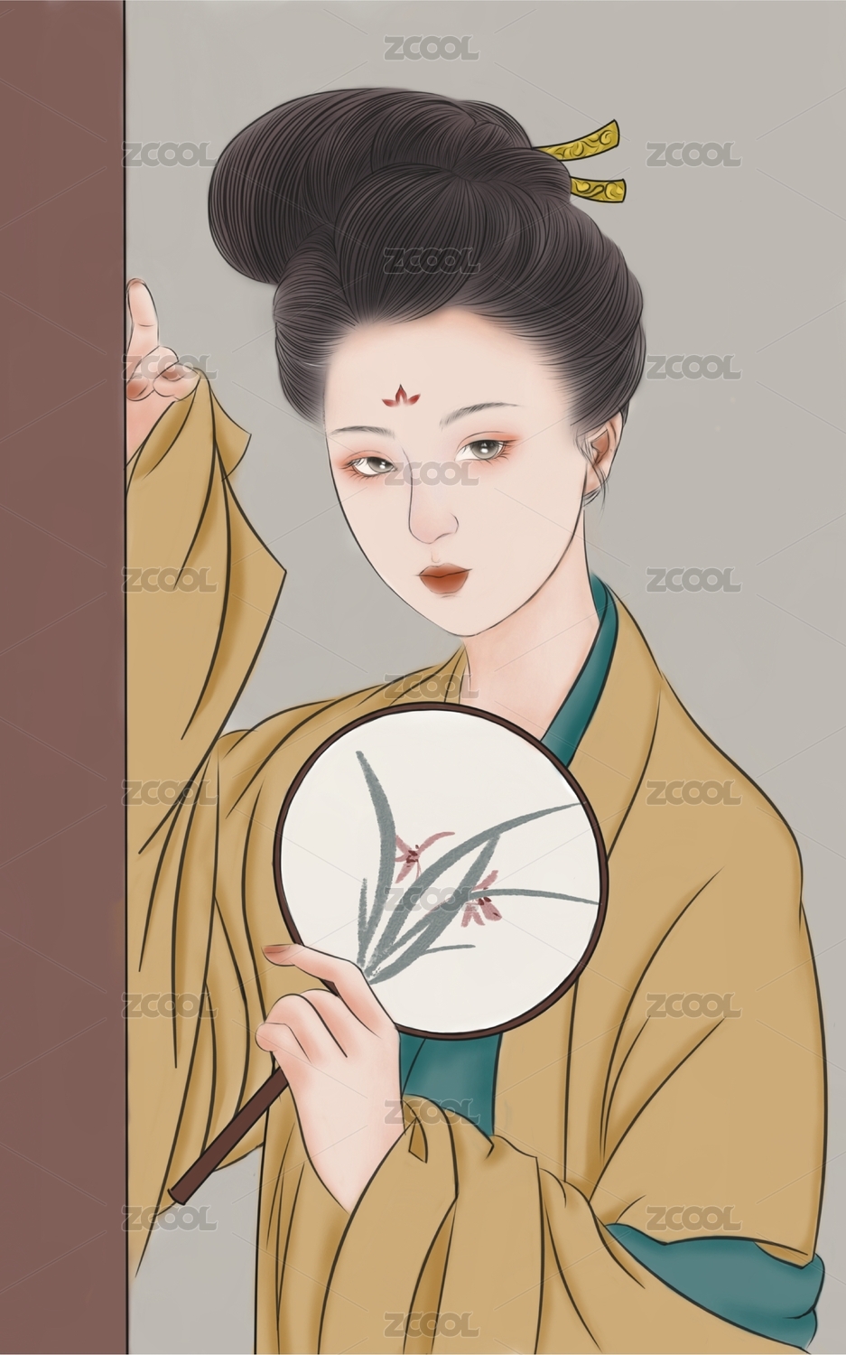 拿着扇子穿着黄色汉服长裙梳着发髻的女孩