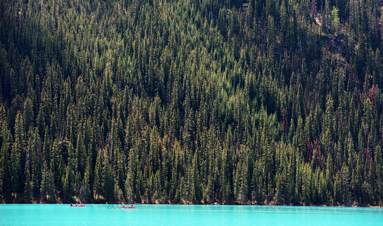 北美加拿大班夫国家公园里森林湖泊中的划船运动