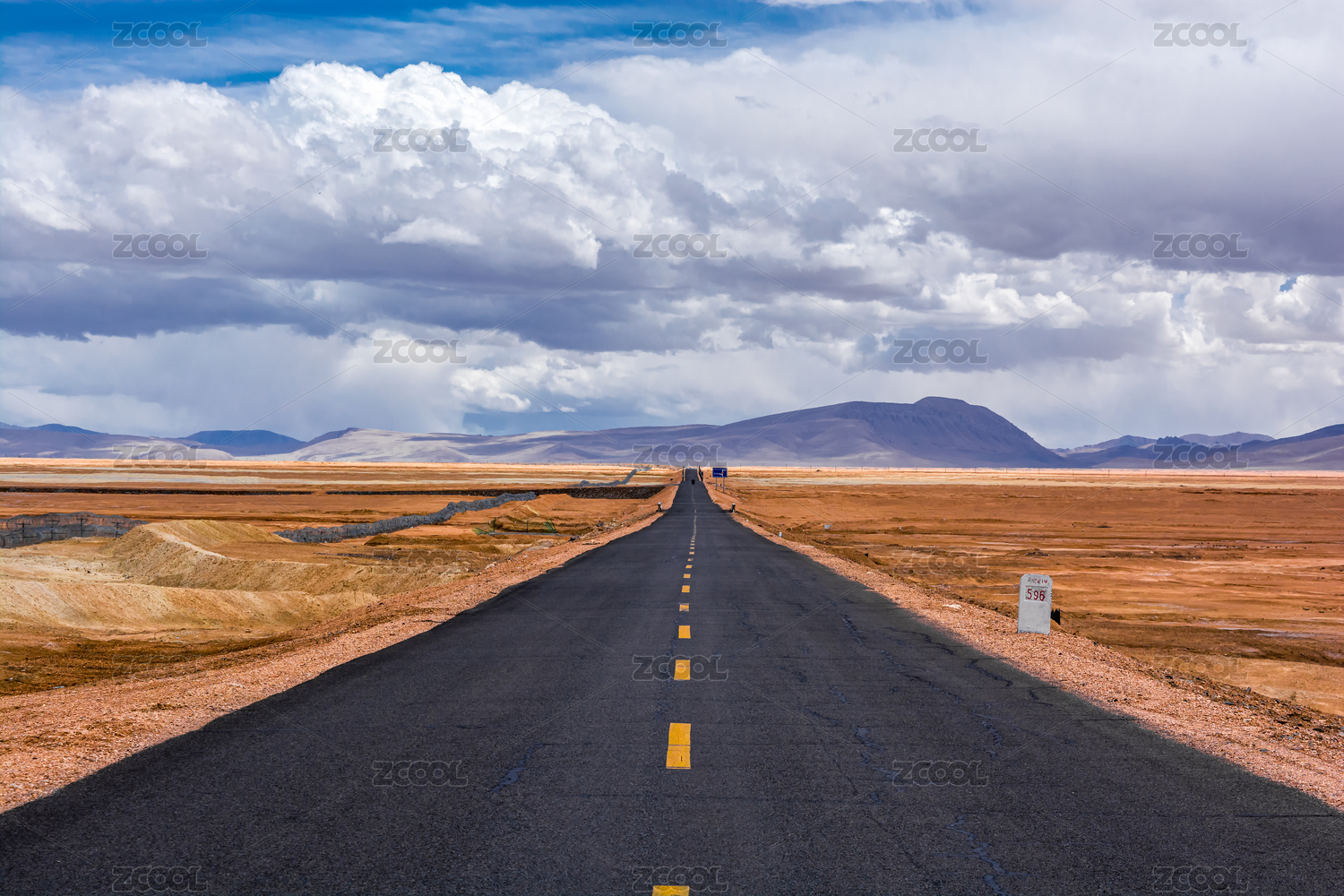 蓝天白云下中国G219新藏公路和戈壁荒漠
