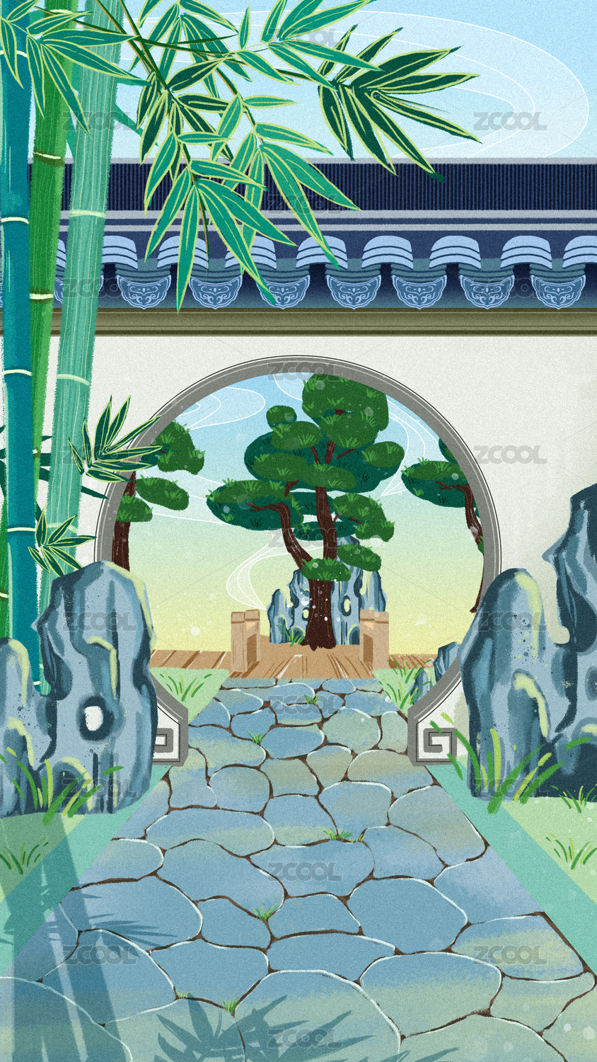 苏式园林里拱门下的石板路两边种着竹子插画