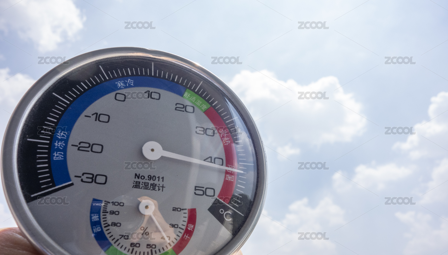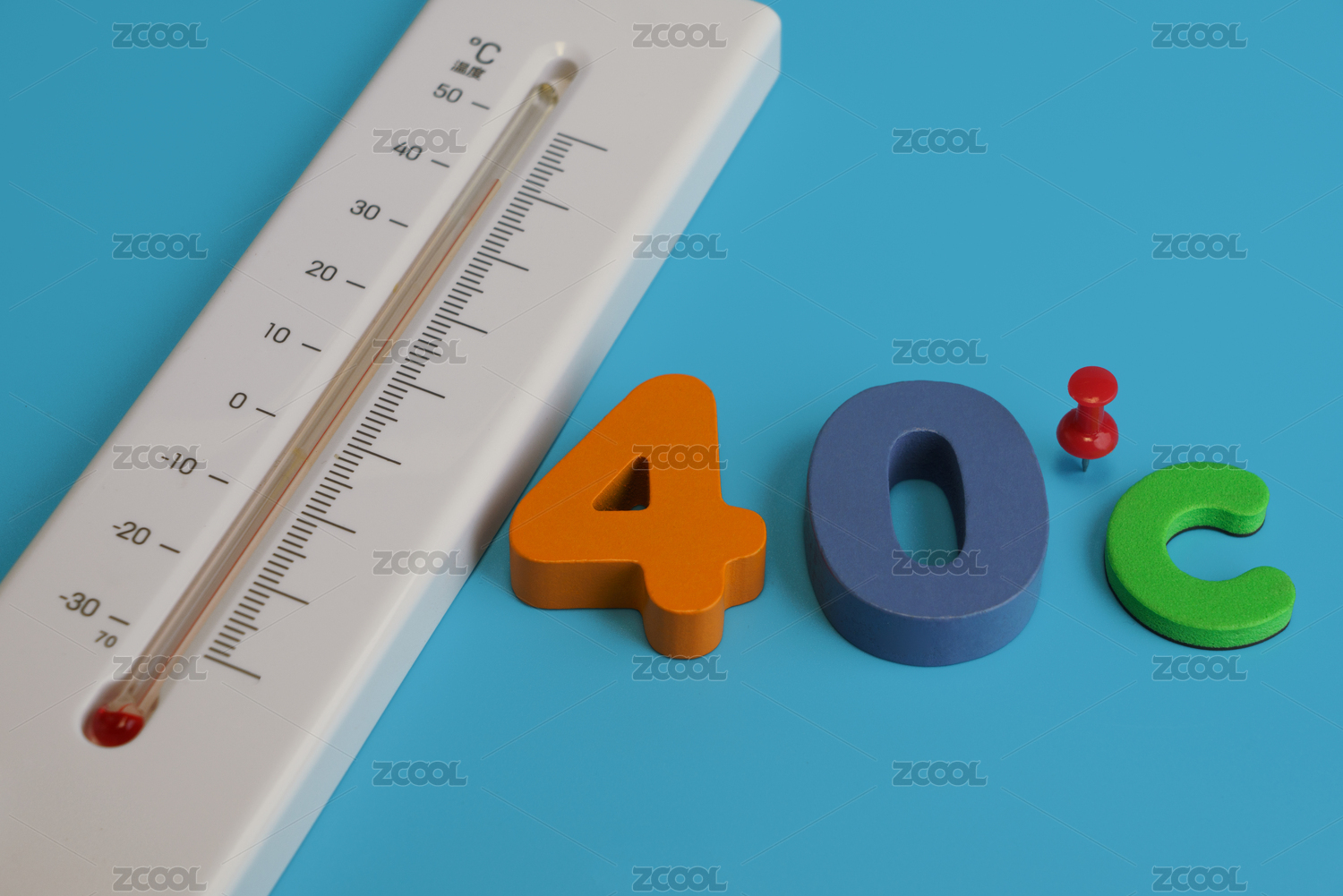 蓝色背景下带温度计冰淇淋和太阳镜静物照