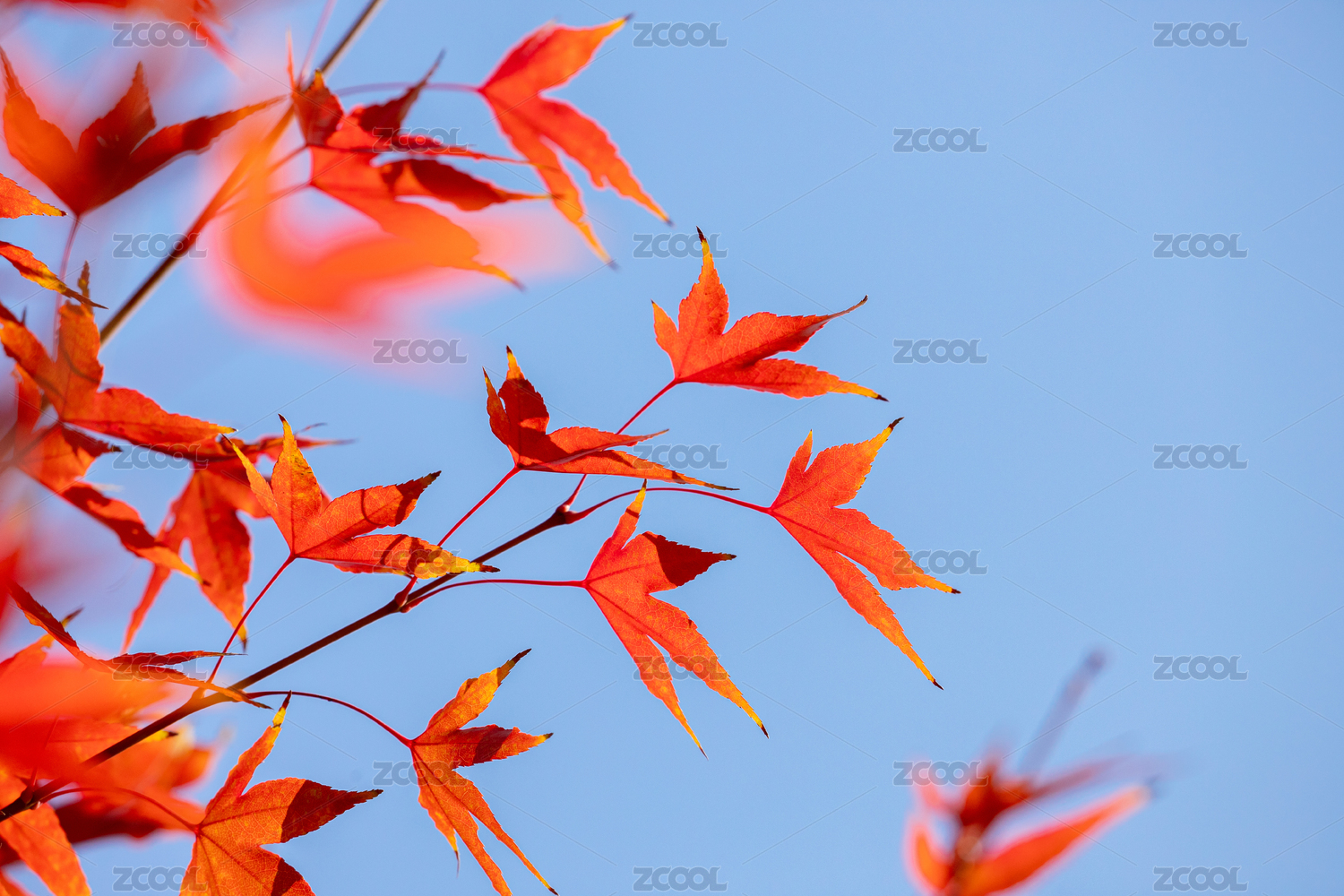 特写侧逆光条件中蓝天下一枝红枫树枝