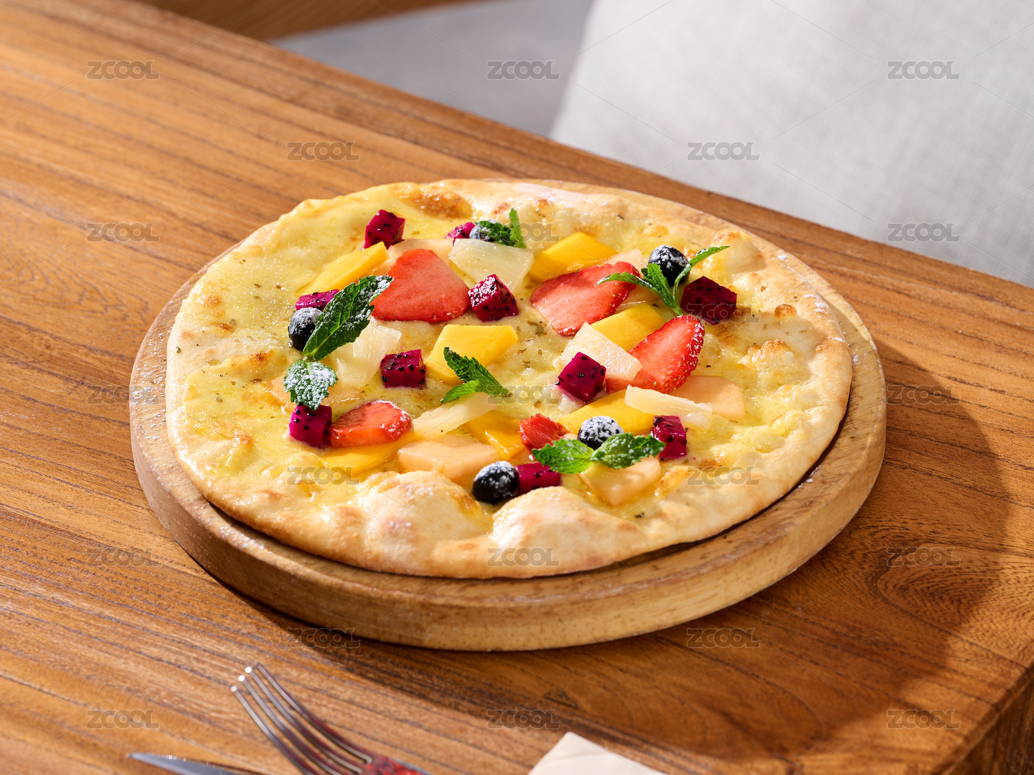 木色桌面上侧逆光硬光拍摄暖色调披萨摄影