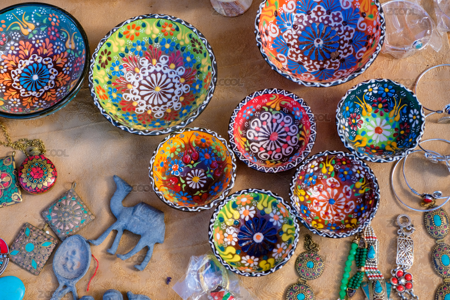约旦佩特拉古城售卖花纹丰富的波斯碗纪念品