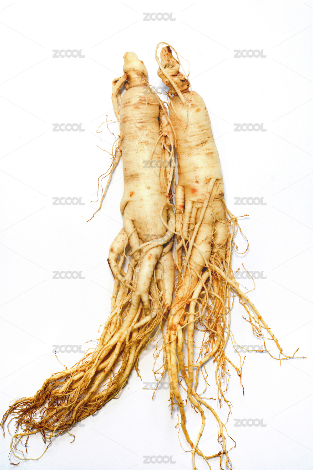 白色背景上摆放的药食材人参