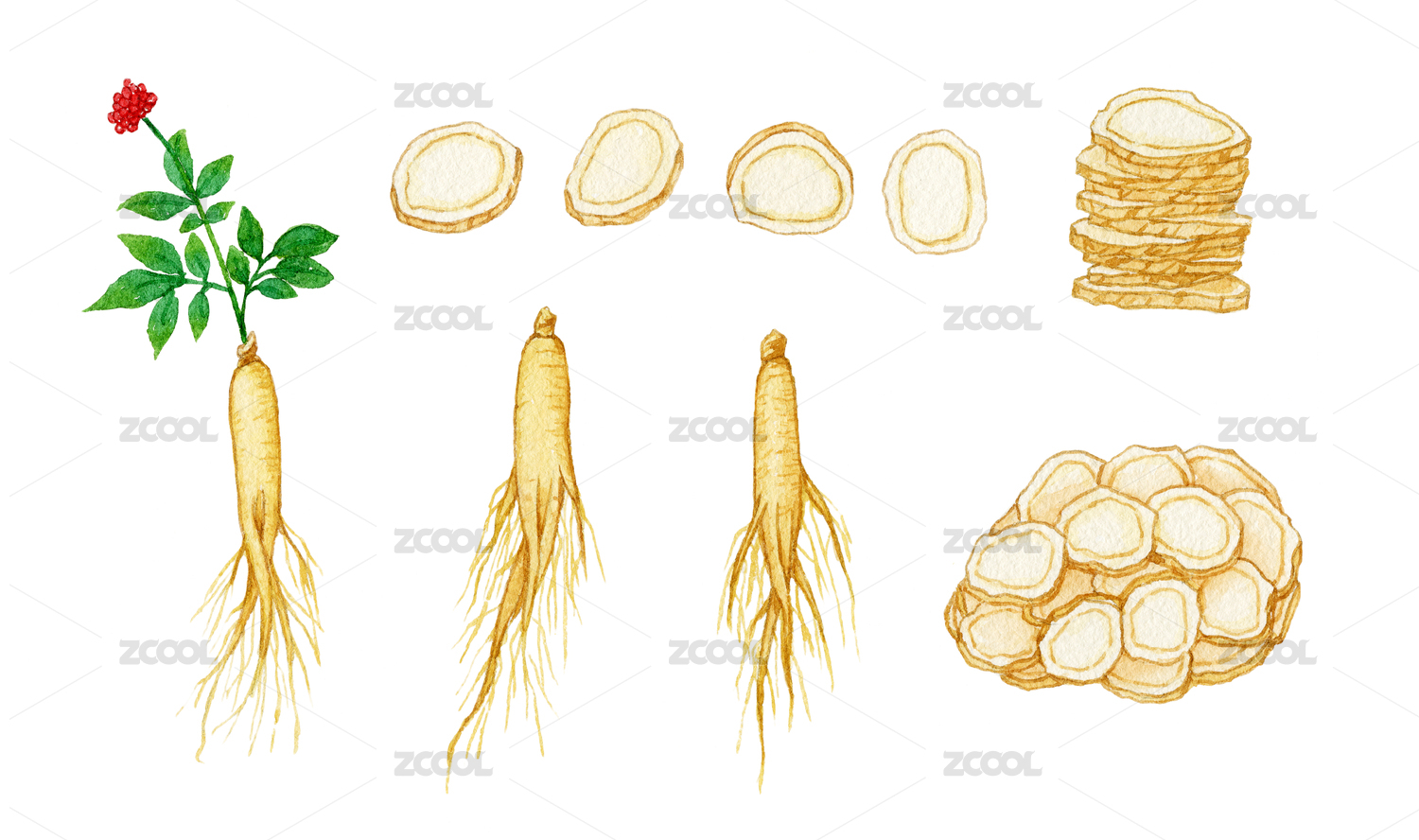 中药人参和人参切片 水彩手绘插画