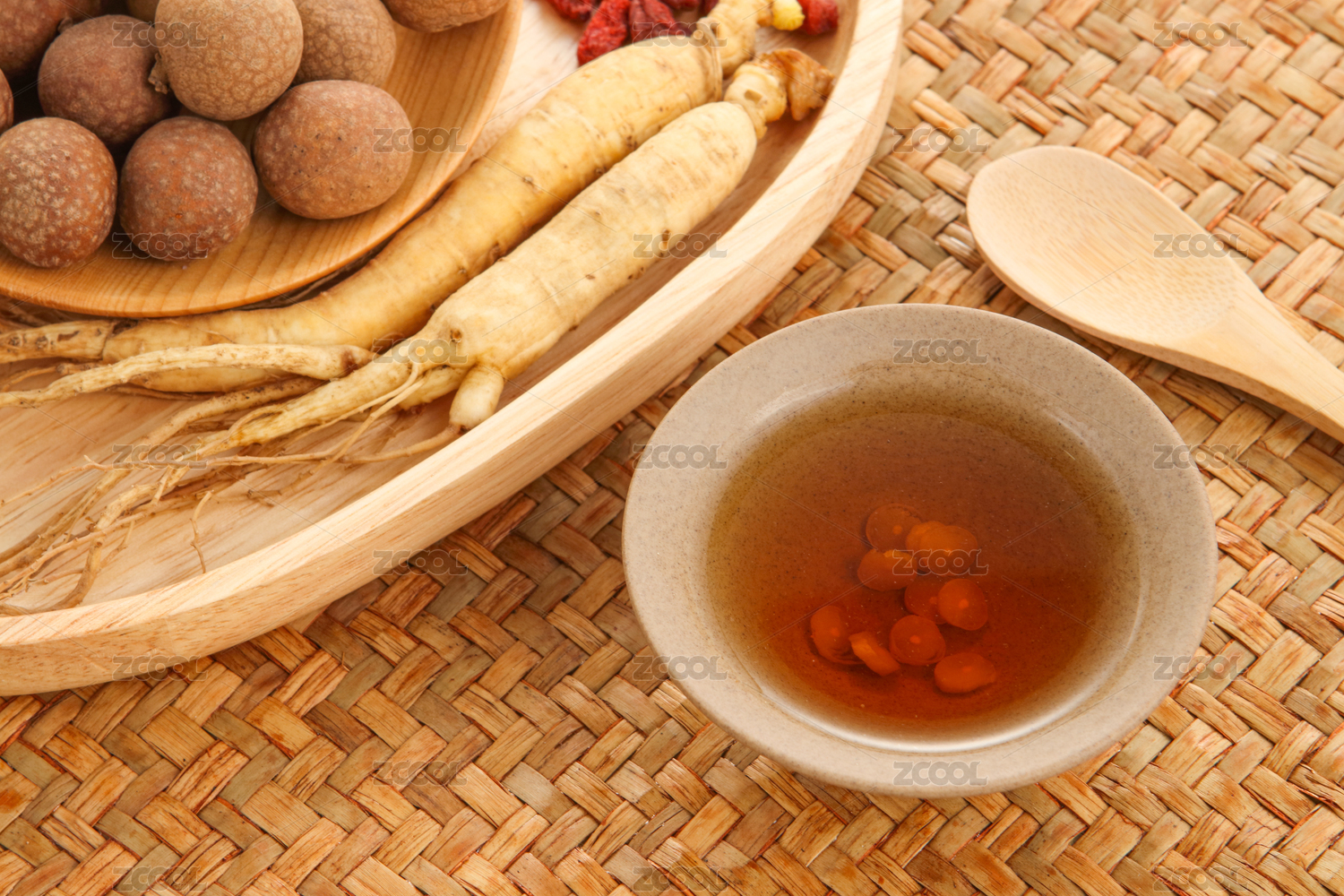 人参、枸杞、红枣在桌面上