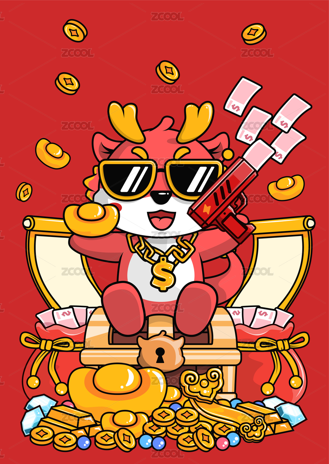 龙年矢量喷钱枪红包福袋新年祝福传统背景墙