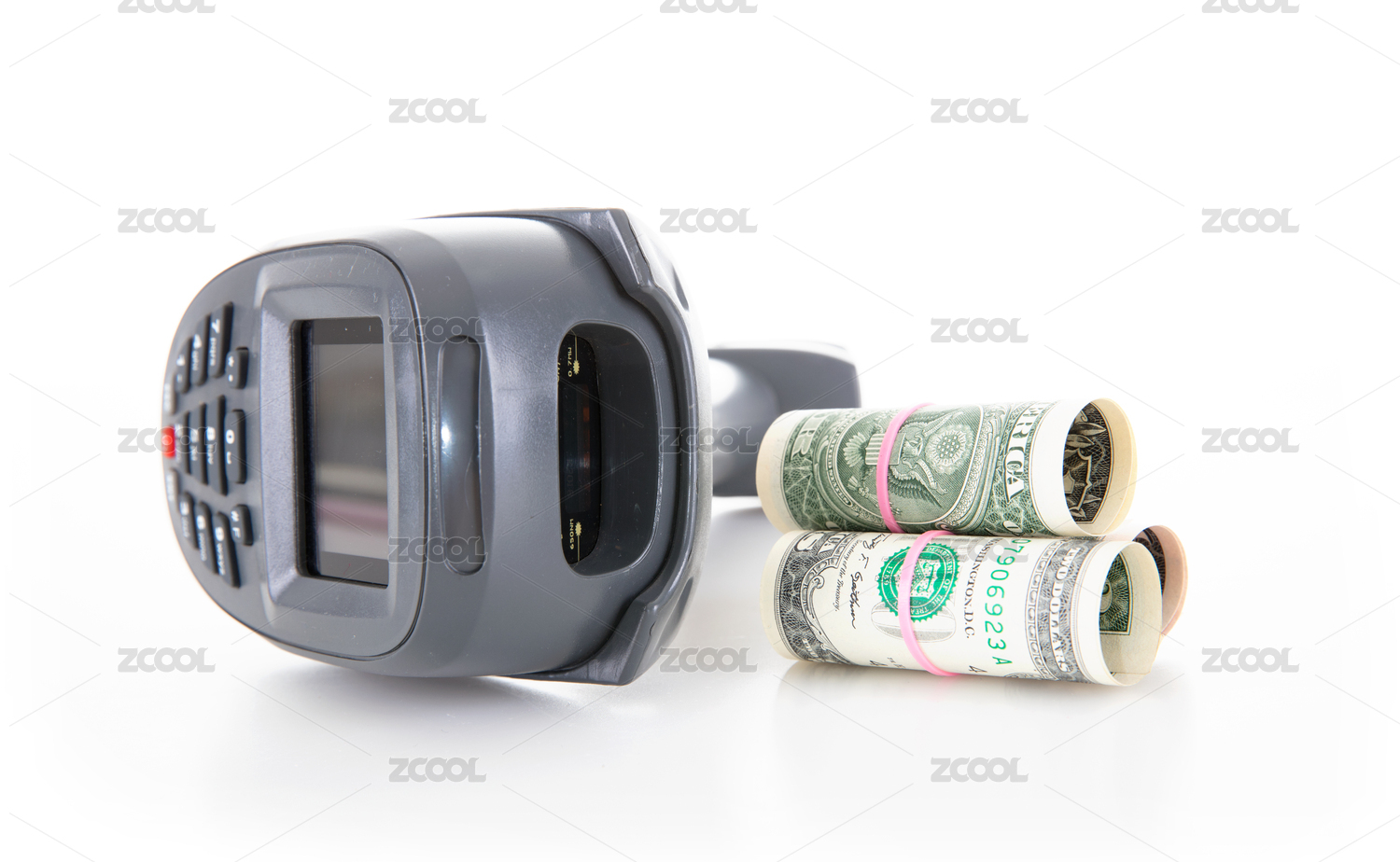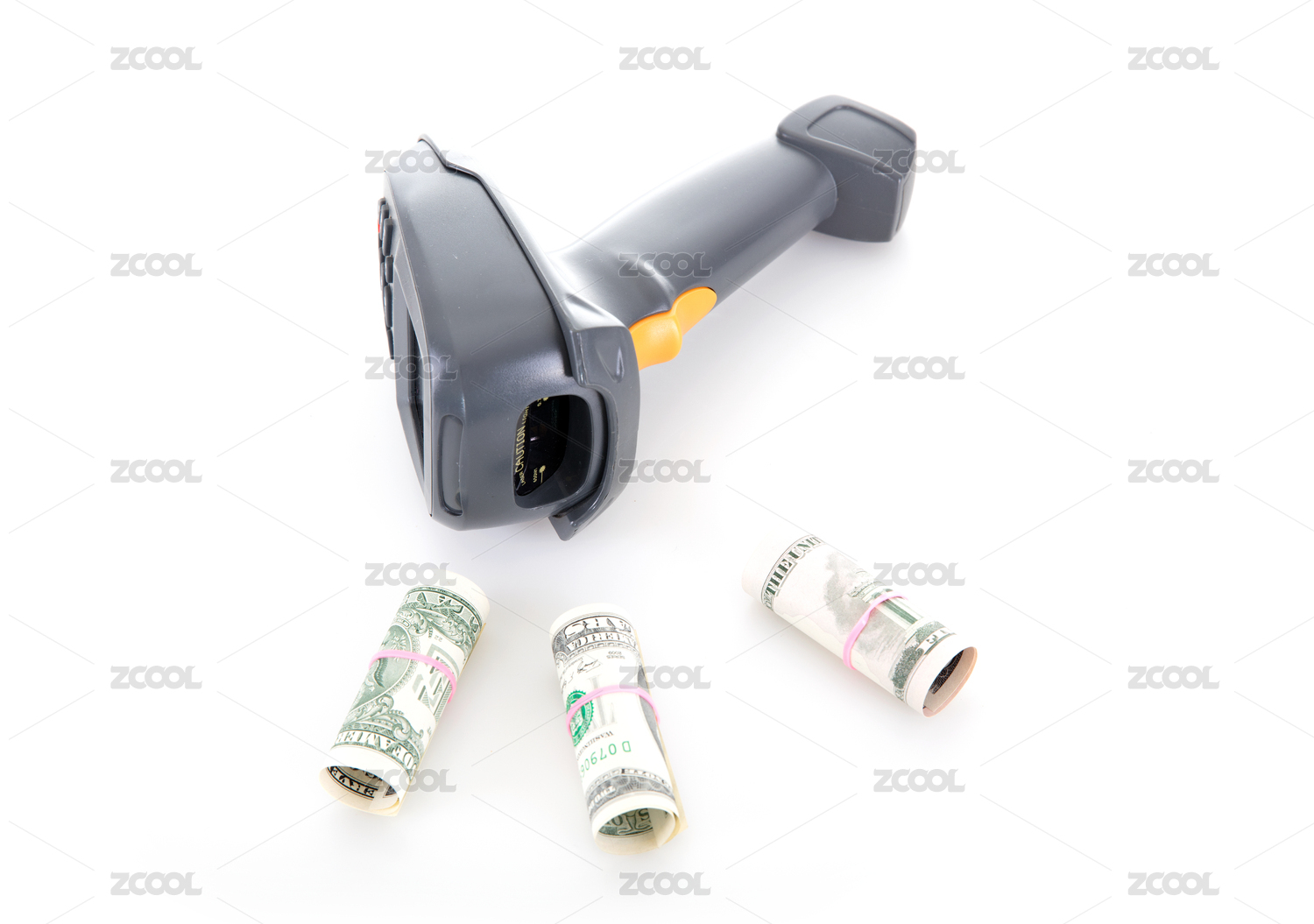 白背景上的扫码枪和美元钞票