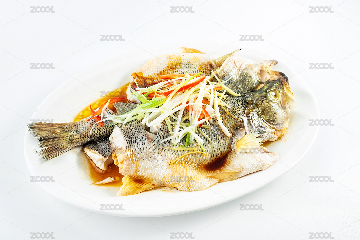中国粤菜一碟清蒸鲈鱼在白背景上