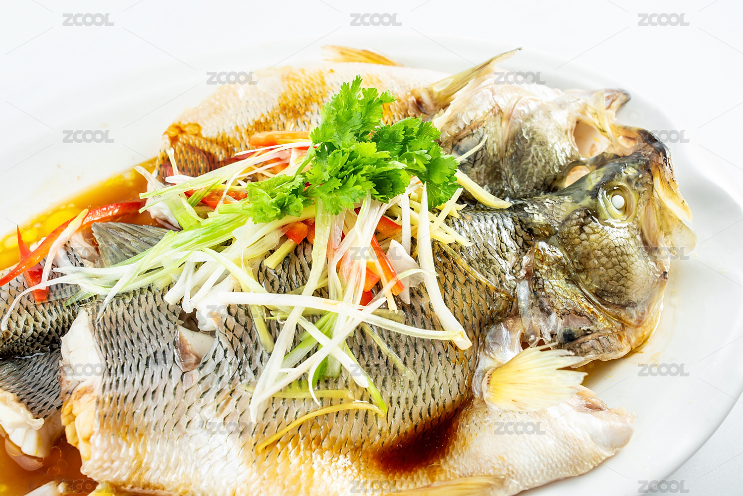 暗色木纹桌面上放着一份清蒸太湖白鱼