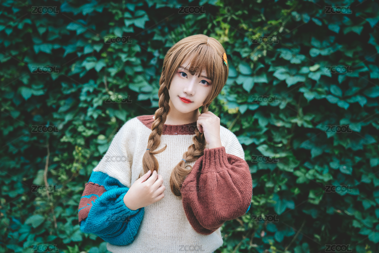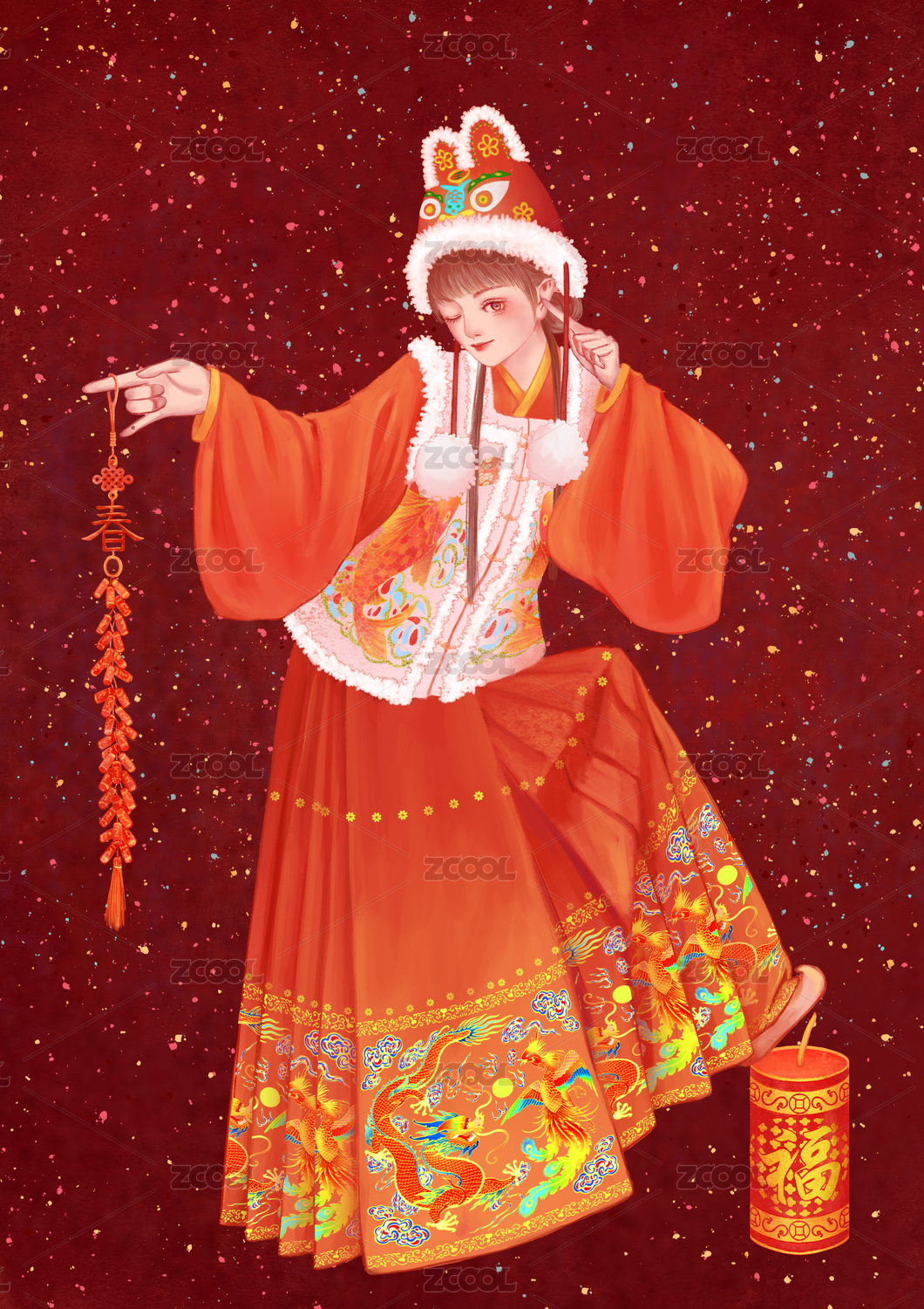夜晚穿着汉服的少女蹲在水边放河灯祈福